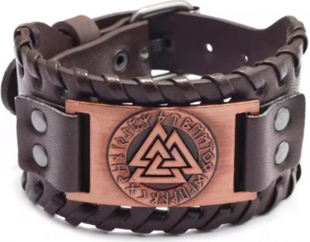 Vikingský široký náramek zdobený symbolem Valknut a runami Široký náramek Štítek zdobený symbolem Valknut a runami Vintage vhled zapínání na přezku, 5 dírek Rozměry: celková délka: 27,8 cm šířka: 4 cm Materiál: eko kůže(umělá kůže - polyueretan), kov, plast