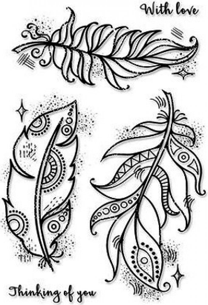 Velikost peříček max. 10x5 cm, nápisy mají výšku 1 cm. Motivy razítek - 3x peříčko, nápis Wiht love, nápis Thinking of you