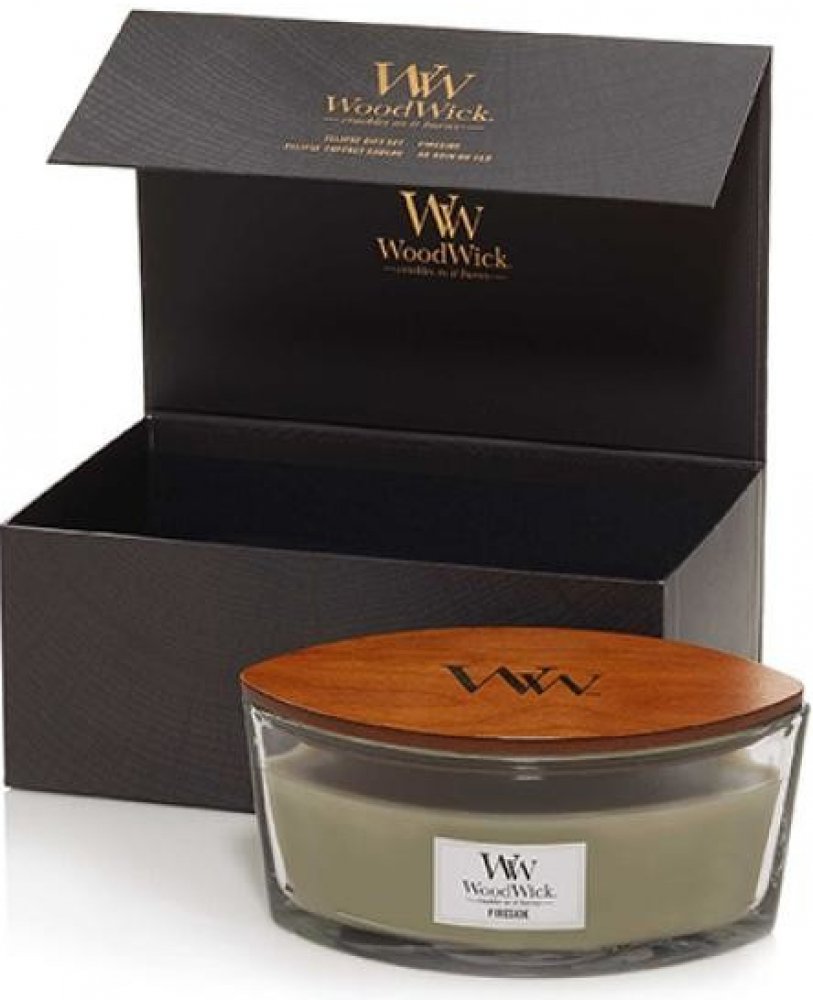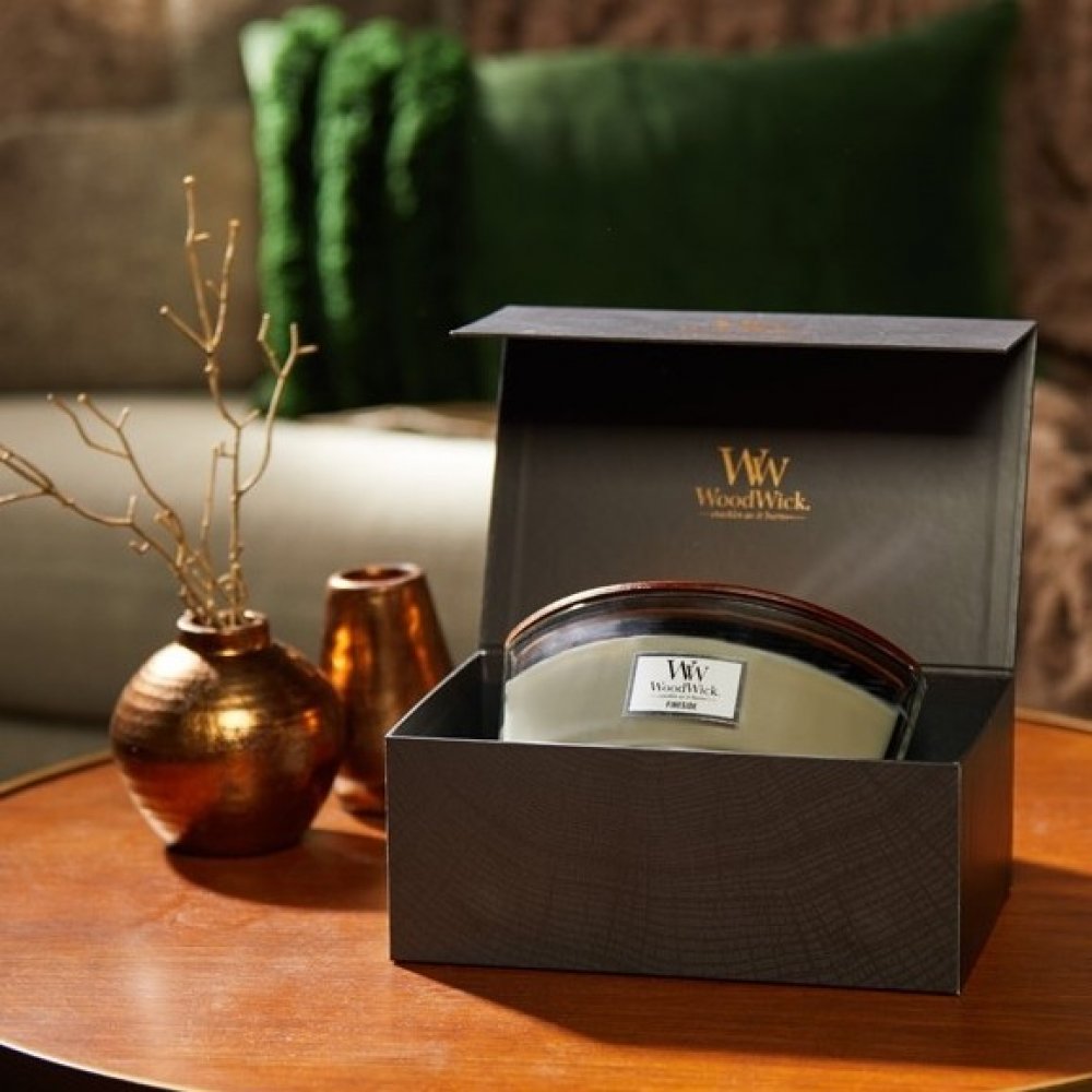 Vonná svíčka WoodWick v nejoblíbenějším provedení velké skleněné vázy ve tvaru lodičky s víčkem z masivního dřeva v luxusním dárkovém balení s odklápěcím víkem. Široký dřevěný knot HearthWick® při hoření jemně praská a má extra zářivý plamen. Směs parafínu s významným podílem sójového vosku je rovnoměrně provoněný a zajišťuje čisté hoření. Otevřený tvar svíčky a velká plocha voskového jezírka zaji...