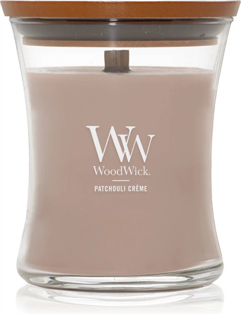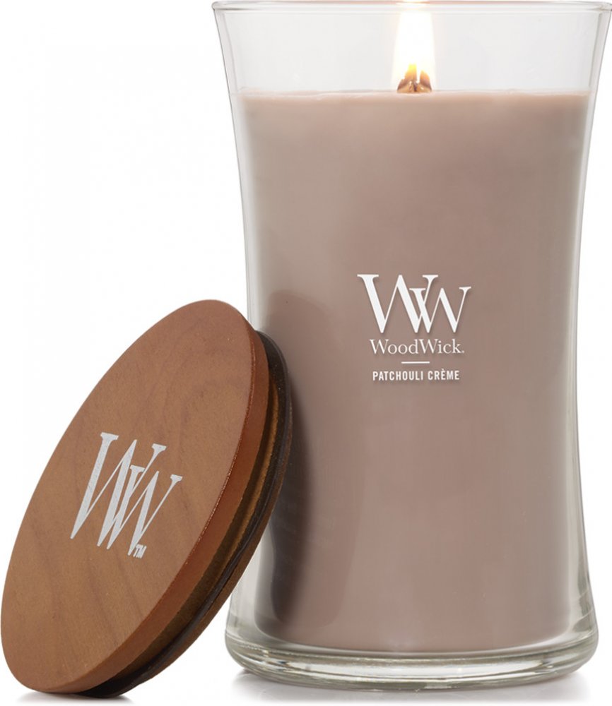 (Patchouli Créme ) Přepychové tóny kakaových bobů, kouřového kašmíru a pačuli se snoubí a vytvářejí bohatou vůni. Elegantně tvarovaná střední svíčka s typickým dřevěným víčkem provoní váš domov a naplní ho jemným zvukem praskajícího knotu, který podpoří atmosféru pohodlí a útulnosti. Neboť domov je tam, kde praská oheň. Knot je vyroben z přírodního dřeva. Složení: směs prémiového parafínu a sójového vosku s vysoce koncentrovanými vůněmi zajišťuje čisté hoření bez nepříjemných zbytků. Vonné esence byly pečlivě vybrané, aby naplnily místnost dlouhotrvající vůní. Otevřený tvar svíčky zvyšuje plochu odpařování vonných esencí z voskového jezírka a zajišťuje rovnoměrný vonný zážitek. Patentovaný tvar dřevěného knotu Pluswick® Innovation vytváří uklidňující zvuk praskajícího ohně.