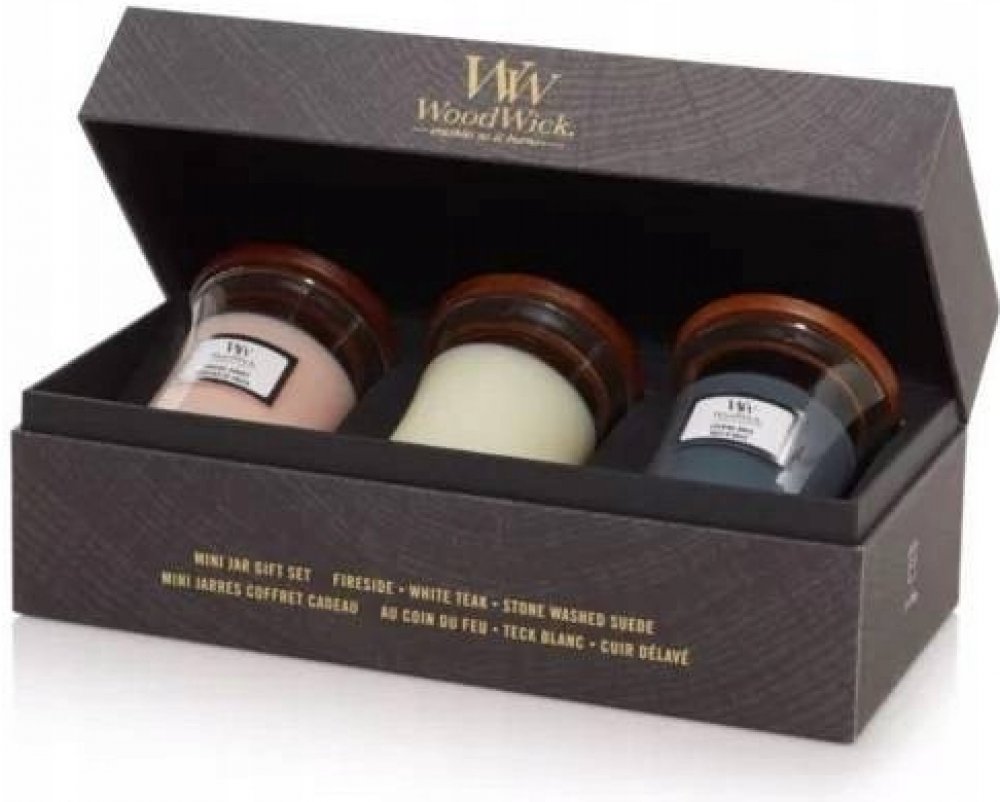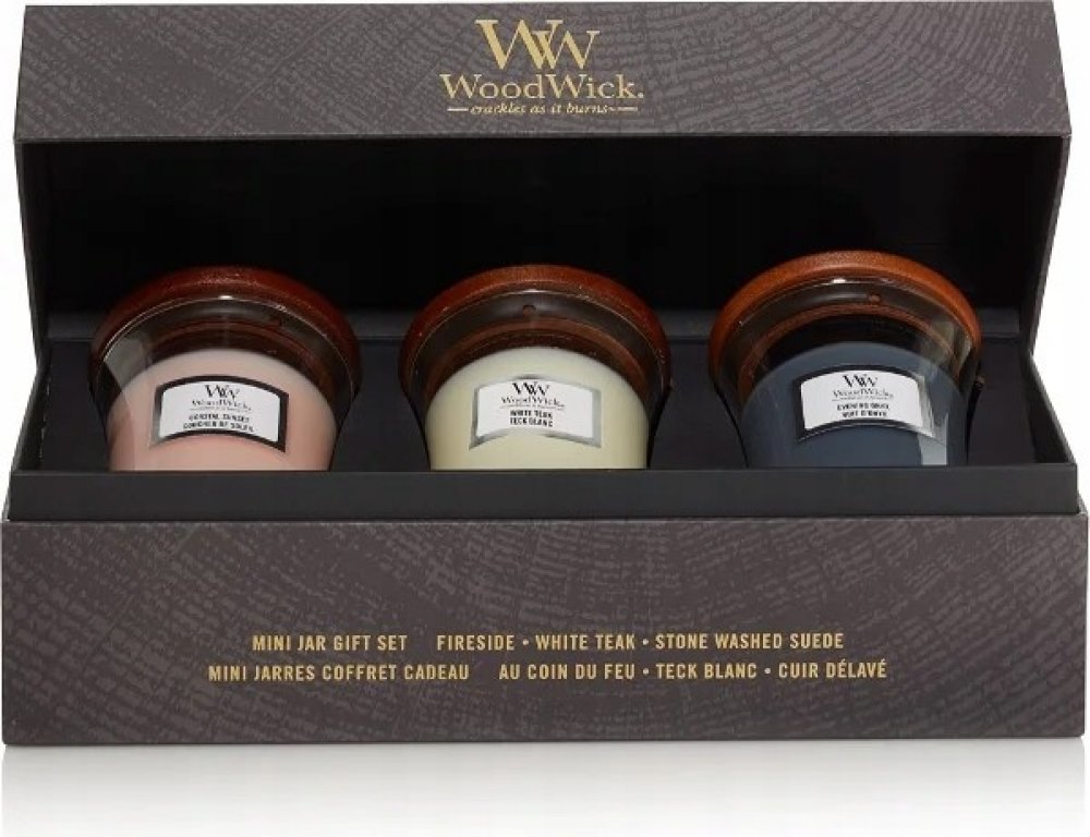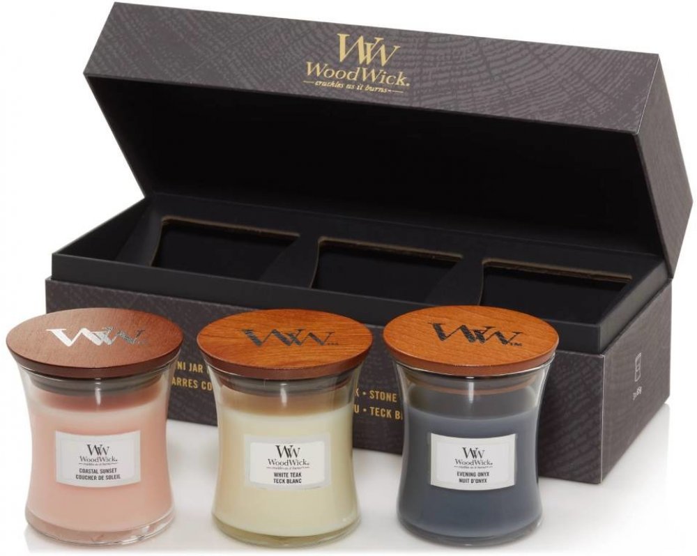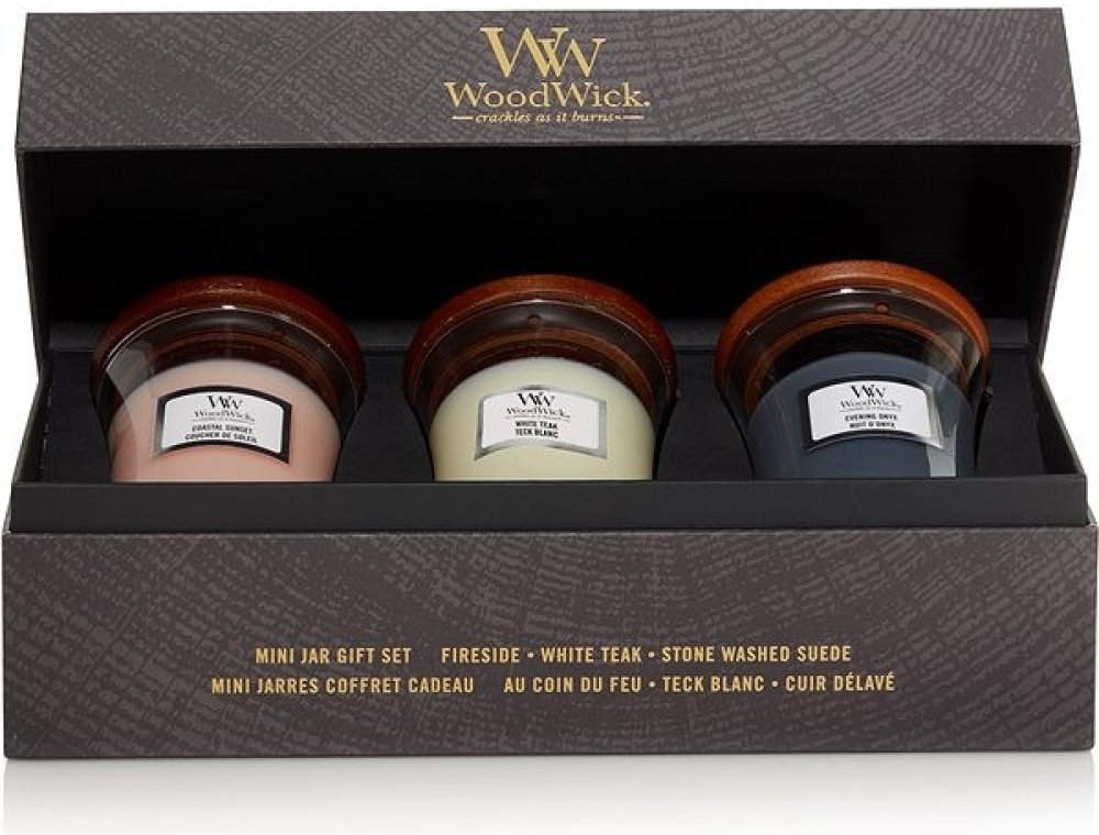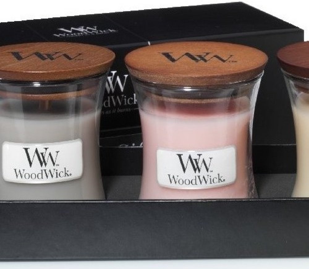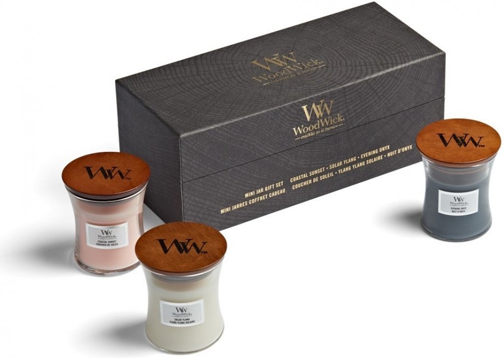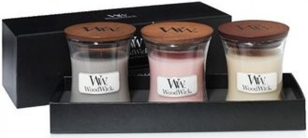 Sada malých svíček s výběrem nejoblíbenějších vůní amerického výrobce WoodWick je perfektní dárek pro milovníky vůní. Svíčky v elegantních skleněných nádobách s dřevěným víčkem obsahují rovnoměrně provoněnou směs parafínu a sójového vosku a unikátní dřevěný knot Pluswick®, který při hoření jemně praská a přispívá k relaxační atmosféře. Velikost svíček je vhodná k provonění menšího prostoru nebo ja...