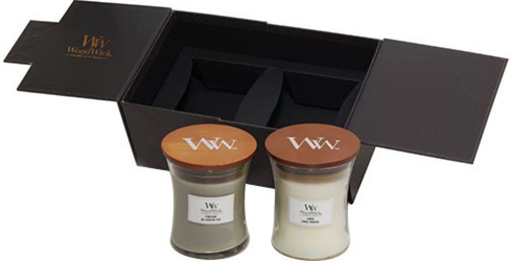 Elegantní černá dárková sada s 2 středními svíčkami ve vůních: Fireside, a Linen. Designově propracovaná svíčka v oválné skleněné váze z ručně foukaného čirého skla dekorována mohutným dřevěným víčkem s pryží po obvodu, která zabraňuje vyprchávání vůně. Dřevěné víčko poslouží jako podstavec pod svíčku při jejím hoření a chrání tak povrch nábytku. Nová patentovaná inovace 100% přírodního dřevěného ...