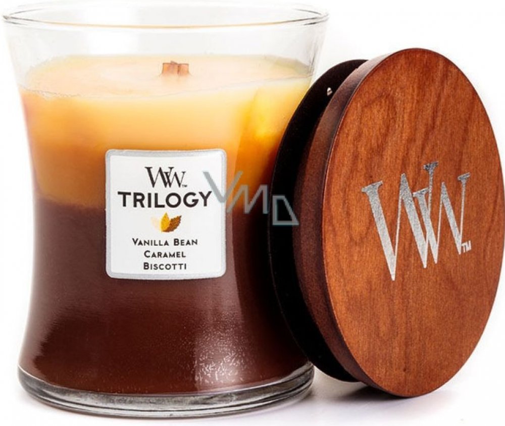 Vonná svíčka WoodWick Trilogy obsahuje tři vzájemně sladěné vůně v elegantní skleněné váze s dřevěným víčkem. Tři barevné vrstvy obsahují vůně, které se při hoření postupně prolínají a vytváří jedinečný voňavý zážitek. Patentovaný dřevěný knot Pluswick® má extra zářivý plamen a přináší jedinečný zážitek praskání, připomínající oheň v krbu. Směs prémiového parafínu a sójového vosku s vysoce koncent...