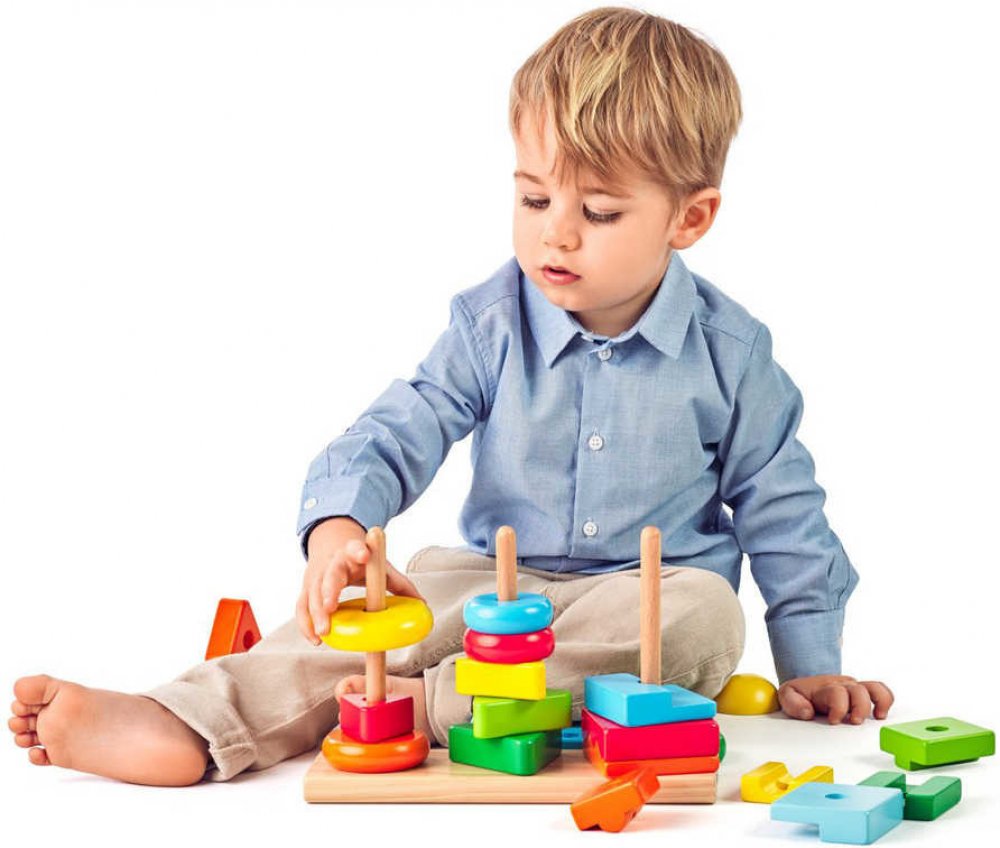 hračka díky třem věžím velkou výhodu: nabízí dlouhodobější využití hračky. Menší děti se totiž učí jen navlékat jednotlivé dílky na tyč. Dalším krokem je rozlišování různých tvarů. Třetím vývojovým krokem je okamžik,