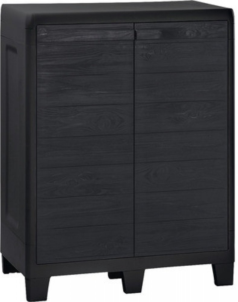 Zahradní skříň se 2 dveřmi, 7 nohami a 2 policemi s různě nastavitelnou výškou a dřevěným vzhledem. Vhodná pro použití v exteriéru. Certifikát TÜV-GS.