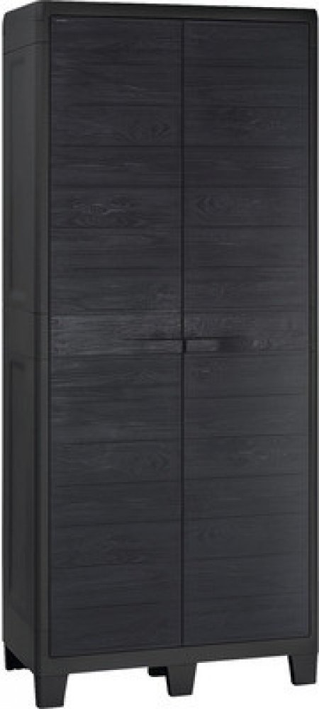 Zahradní skříň se 2 dveřmi, 7 nohami a 4 policemi s různě nastavitelnou výškou a dřevěným vzhledem. Vhodná pro použití v exteriéru. Certifikát TÜV-GS.
