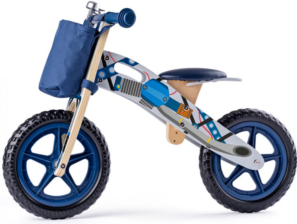 Odrážedlo z dřevěného materiálu v designu motorky v modrém barevném provedení je vynikající pro přípravu na první jízdu na kole. Odrážedlo má lehkou dřevěnou konstrukci . Systém dorazů řídítek, který brání nehodám při přetočení, více poloh sedla a bezpečnostní zvonek. Odnímatelná , látková kapsička na řídítkách.Děti získají rovnováhu a naučí se řídit. Rozměr: 85 x 55 cm výška. Věk: 3+