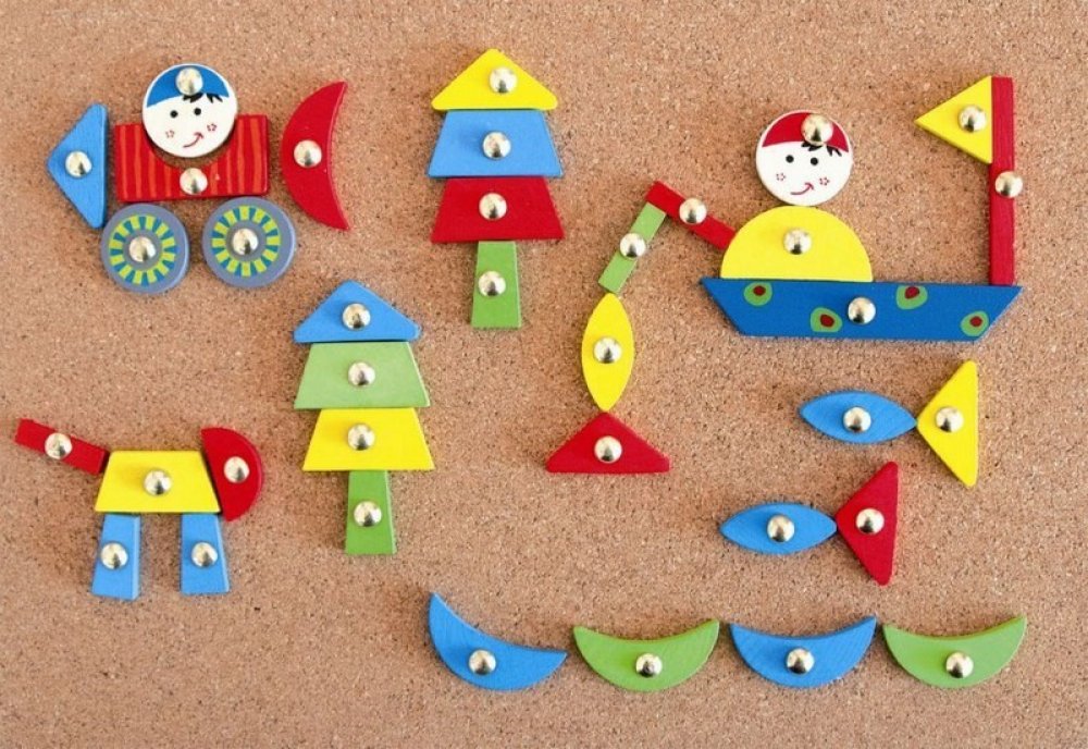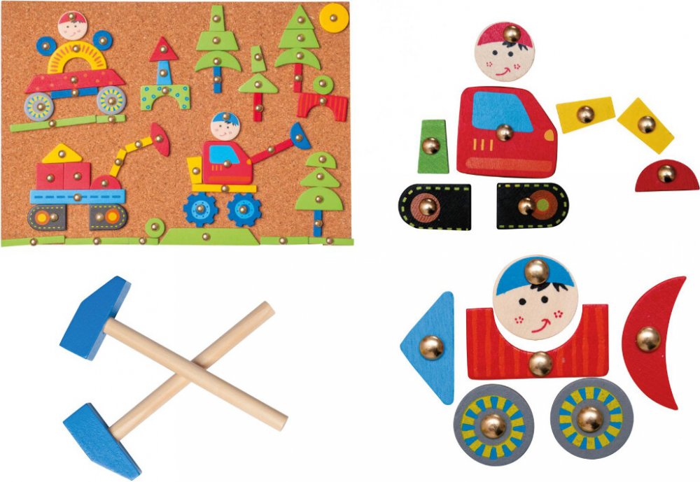 Dítě si může pomocí přiložených tvarů vymodelovat jakýkoli obrázek, všechny tvary musí spojit s deskou pomocí přibíjecích hřebíčků s kulatou hlavou.