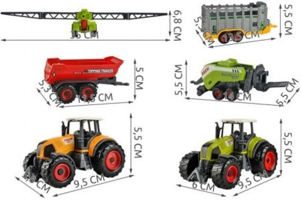 Zábava s použitím rozsáhlé sady hraček napodobujících zemědělské stroje je přinese Vašemu dítěti hodně radosti, ale i získání poznatků o světě, o pravidlech výroby potravin. Zemědělská souprava - zemědělské stroje obsahují 6 strojů, mezi kterými jsou: 2 traktory, přívěsy na přepravu zvířat, přívěsy, sklápěče a lisy.