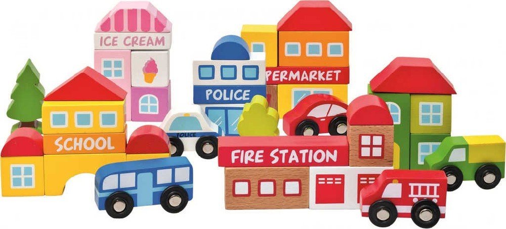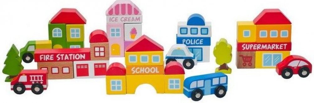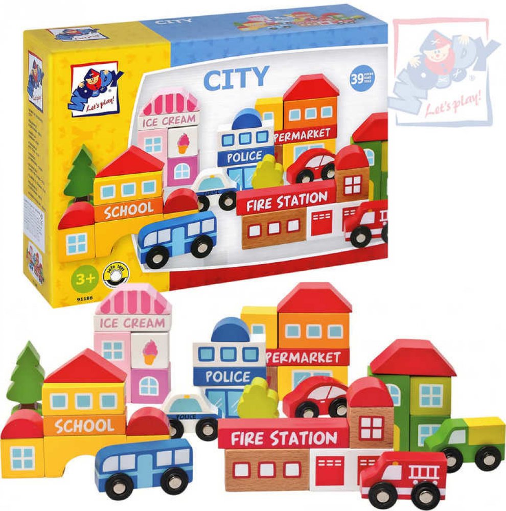 Obsah balení: 39 dílů (škola, cukrárna, policie, supermarket, hasičská stanice, 5 autíček, 2 stromy...)