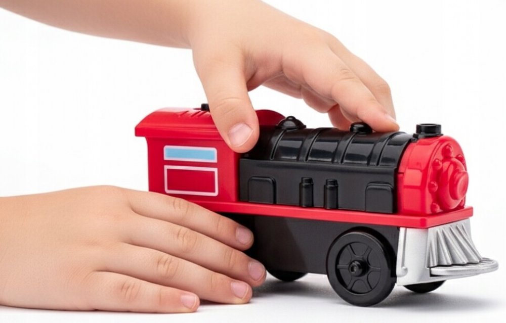 Sledovat lokomotivu jak projíždí, je někdy zábavnější než s ní přímo jezdit. Červená mašinka je vybavena magnetem pro připojení vagónku. Přepínač pro pohyb vpřed a vzad je umístěný na střeše. Dokáže vyjet stoupání i bezpečně sjet svou stejnoměrnou rychlostí, dobře drží v kolejišti a je tak spolehlivým pomocníkem a příjemným společníkem na cestách po železnici.