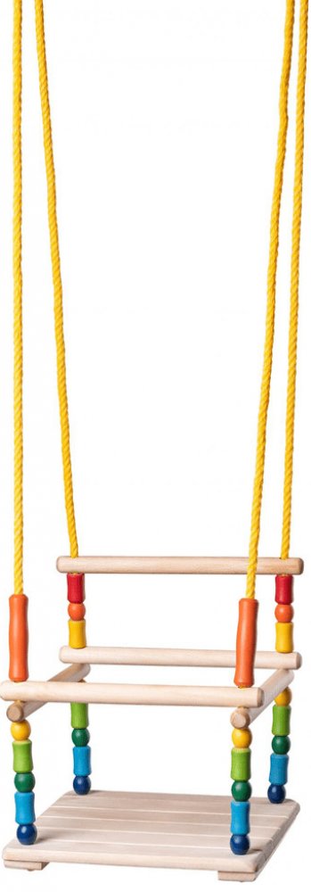 Tato houpačka pro nejmenší děti je vyrobena z masivního dřeva. Je opatřena bezpečnostní ohrádkou. Zvednutím přední tyčky ohrádky se dítě snadno dostane dovnitř i ven. Houpačka má