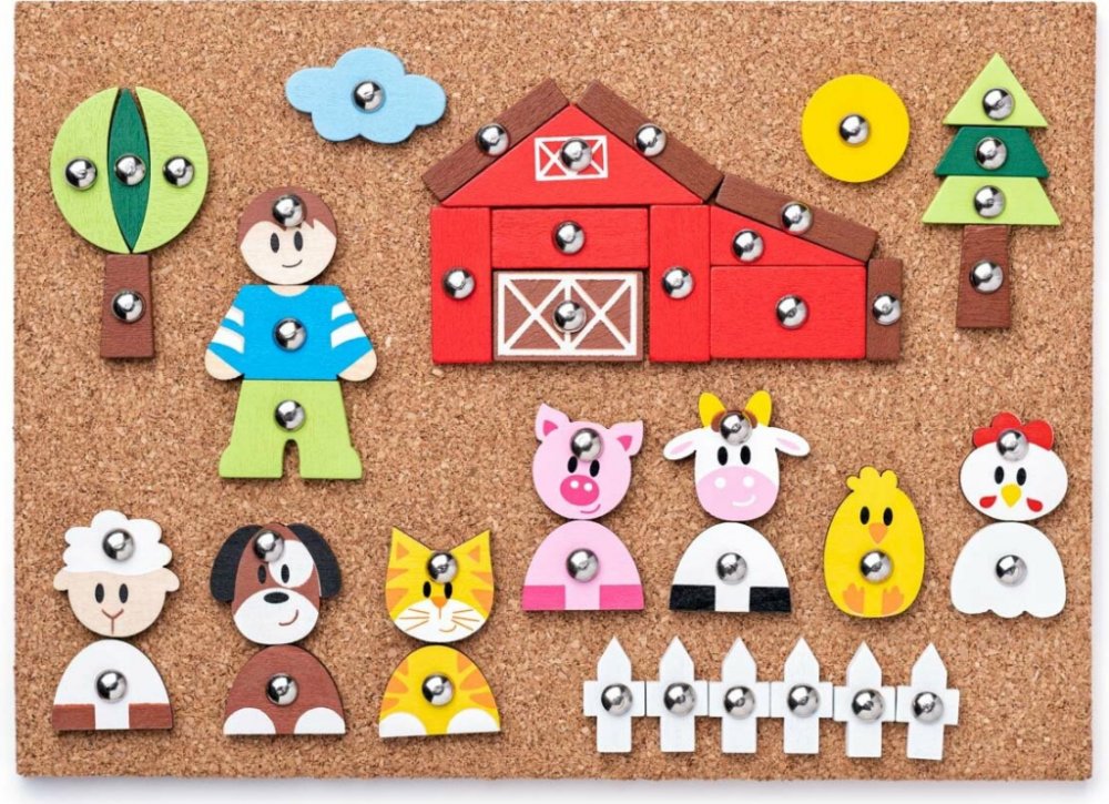 Staň se malým kutilem! Děti dovedou z této stavebnice, pomocí kladívka a hřebíčků, vytvořit nekonečné variace obrázků plných fantazie na téma zvířátka a lidé. Práce se stavebnicí podporuje představivost, soustředěnost a přesnou koordinace pohybů. Balení obsahuje : 1 korkovou desku, 2 dřevěná kladívka, 80 hřebíčků a 70 dřevěných tvarů. Rozměr desky: 31 x 21cm Vhodné pro děti od 5 let. Dřevěné hračk...