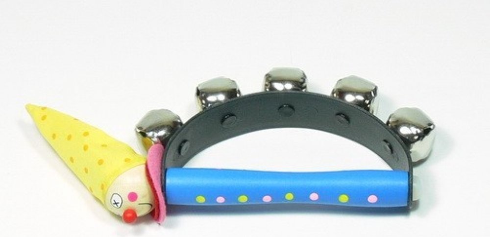 Dřevěné držadlo s plastovým páskem imitující kůži s 5 rolničkami.