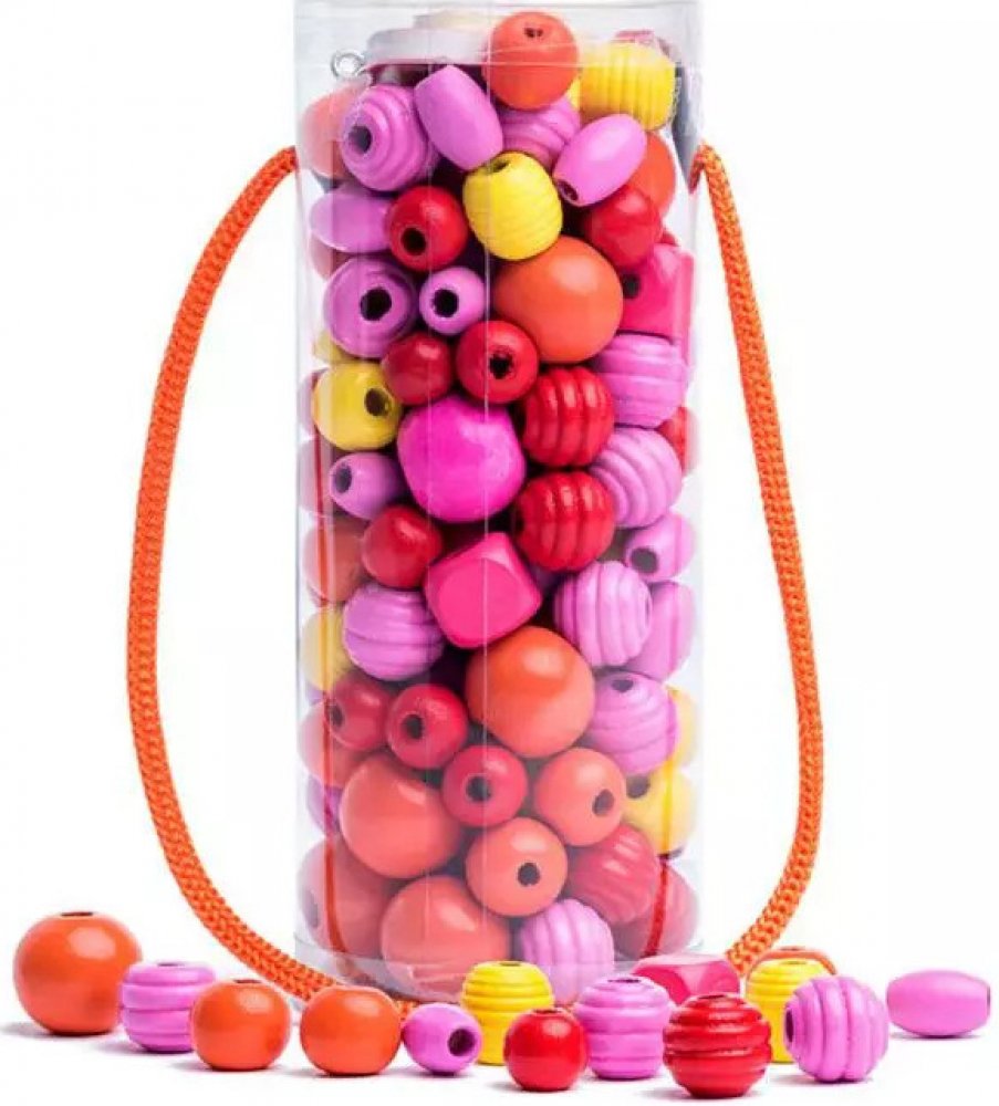 Tuba obsahuje velké množství klasických i soustružených korálků, korálků ve tvaru kytiček a tenké tkanice s koncovkou k provlékání. Vhodné pro rozvoj jemné motoriky. Praktické uzavíratelné balení na cesty. | Věk: 3+ | Rozměr: 6 x 15,5 cm |