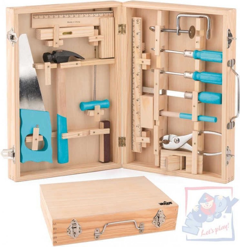 Nástroje jsou většinou o něco menší než tradiční, ale vyrobené jako skutečné z kombinace dřeva a kovu, v pěkném modrém provedení. Nyní může malý milovník kutilství mít svou vlastní sadu nářadí, která je díky praktickému kufříku velmi pohodlná. Kufřík je navržen tak, aby každý nástroj měl své místo. Stačí vzít za praktickou rukojeť a běžet kutit.