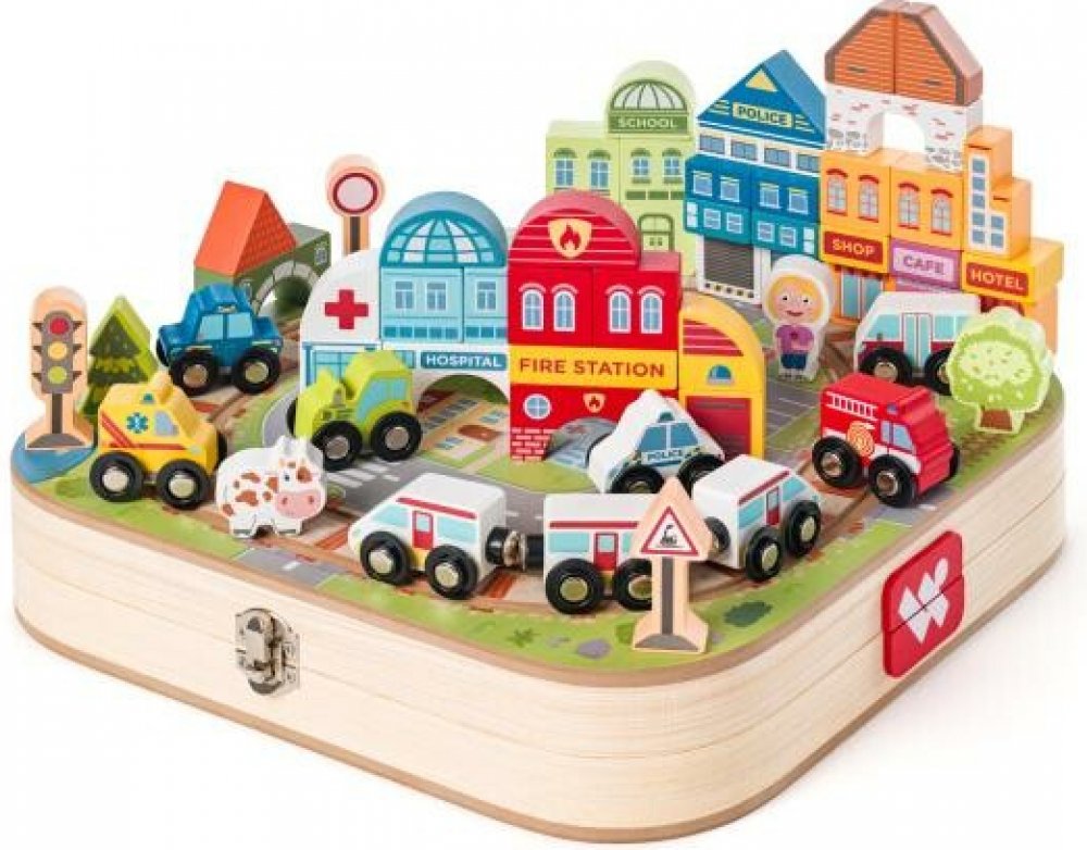 Součástí je 55 dílů, mezi které patří dřevěný vláček, autíčka a kostky pro stavbu domečků, takže si děti mohou vytvořit vlastní město a rozvíjet svou představivost, kreativitu i jemnou motoriku . Jedinečný design pochází od české výtvarnice, což dodává celé sadě originální a krásný vzhled.