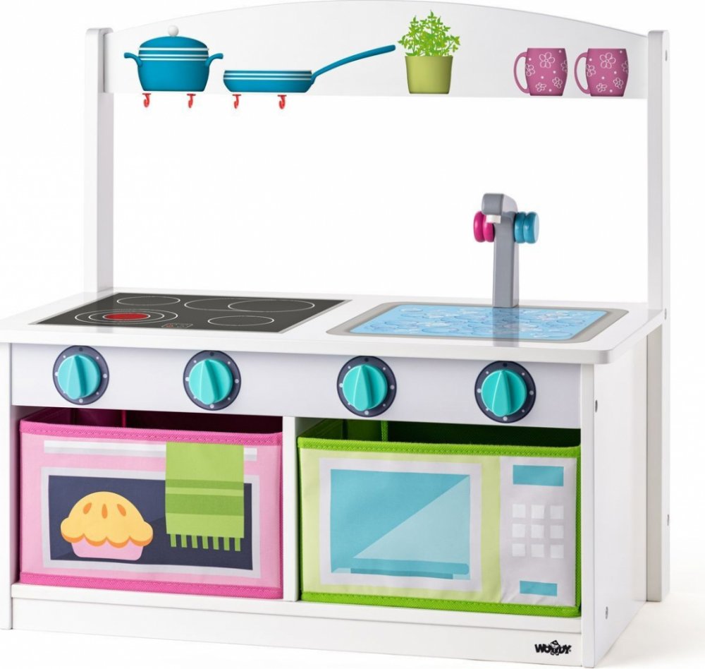 Lavice s úložným prostorem pro hračky je zároveň i kuchyňkou s otočnými knoflíky a vodovodní baterií, která se upevní na vrchní desku pomocí magnetu. Malé kuchařky a kuchtíci zajisté ocení možnost