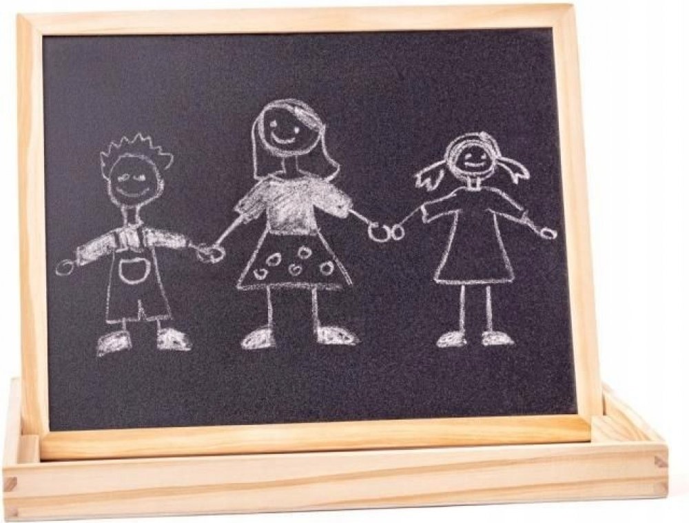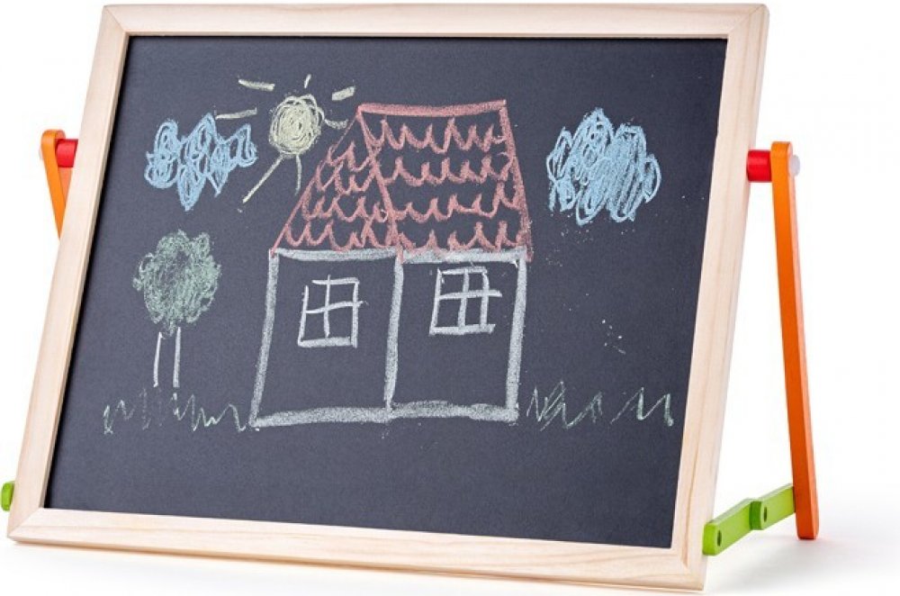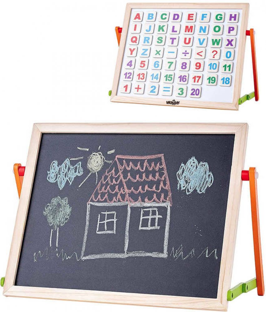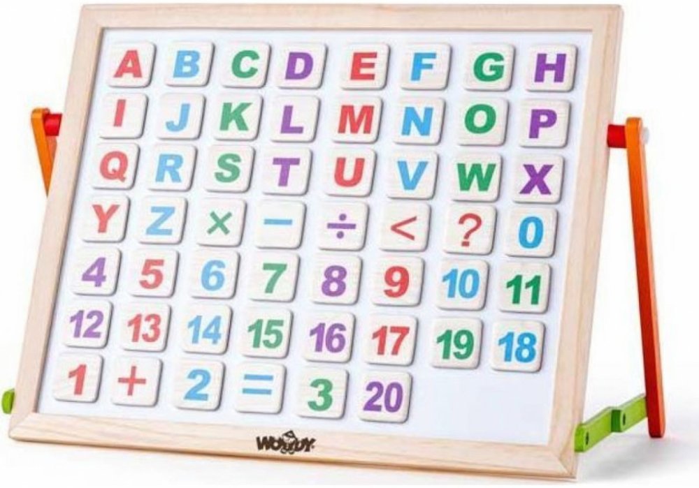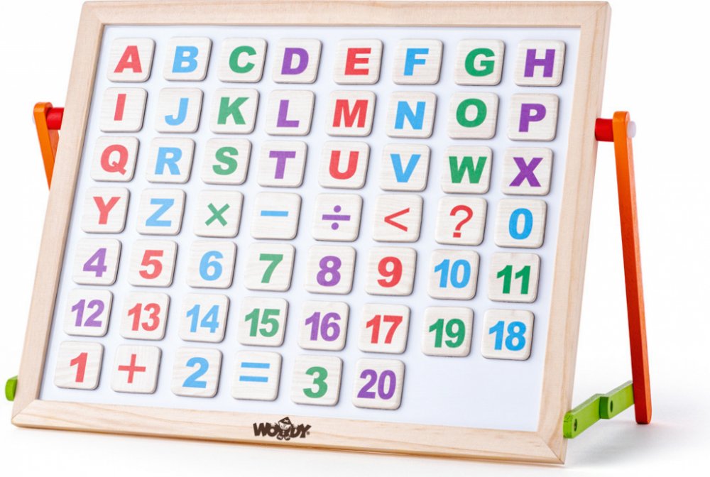 Magnetická tabulka s ABC na stůl. Z jedné strany černá plocha pro psaní křídami, z druhé bílá magnetická plocha pro psaní fixou. Obsahuje velké množství magnetických písmen, čísel i znaků pro nácvik skládání slov i jednoduchých matematických příkladů, dále pak barevné křídy, fix a houbičku. Celkem 57 dílů.