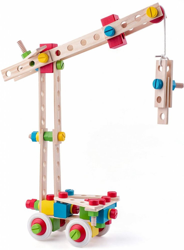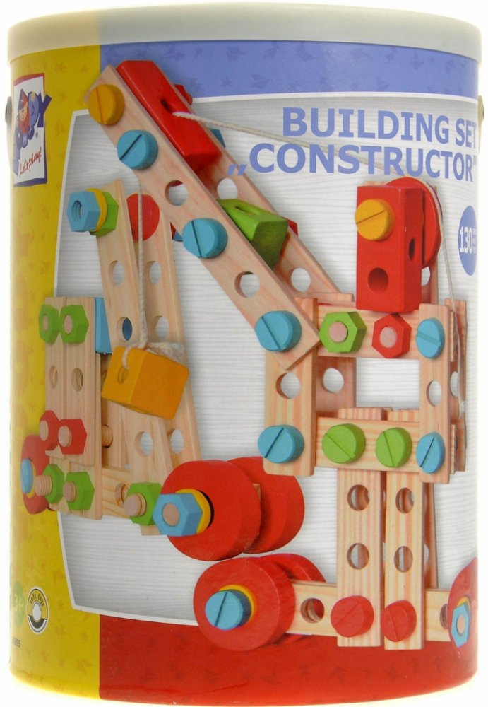 Dřevěná stavebnice nabízí pro malé kutily nekonečné množství variant různých strojů, aut a jeřábů. Praktické balení v kyblíku s víkem je ideální také pro cestování.