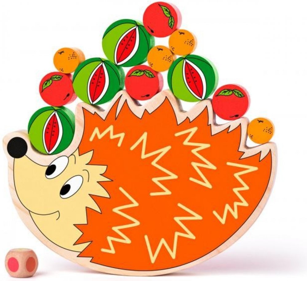 Hra a didaktická pomůcka v jednom. Hráči hází kostkou, na jejíž stranách jsou barevné puntíky, jejíž barva hráči napoví, které ovoce bude na ježka pokládat. Úkolem hráče je položit na