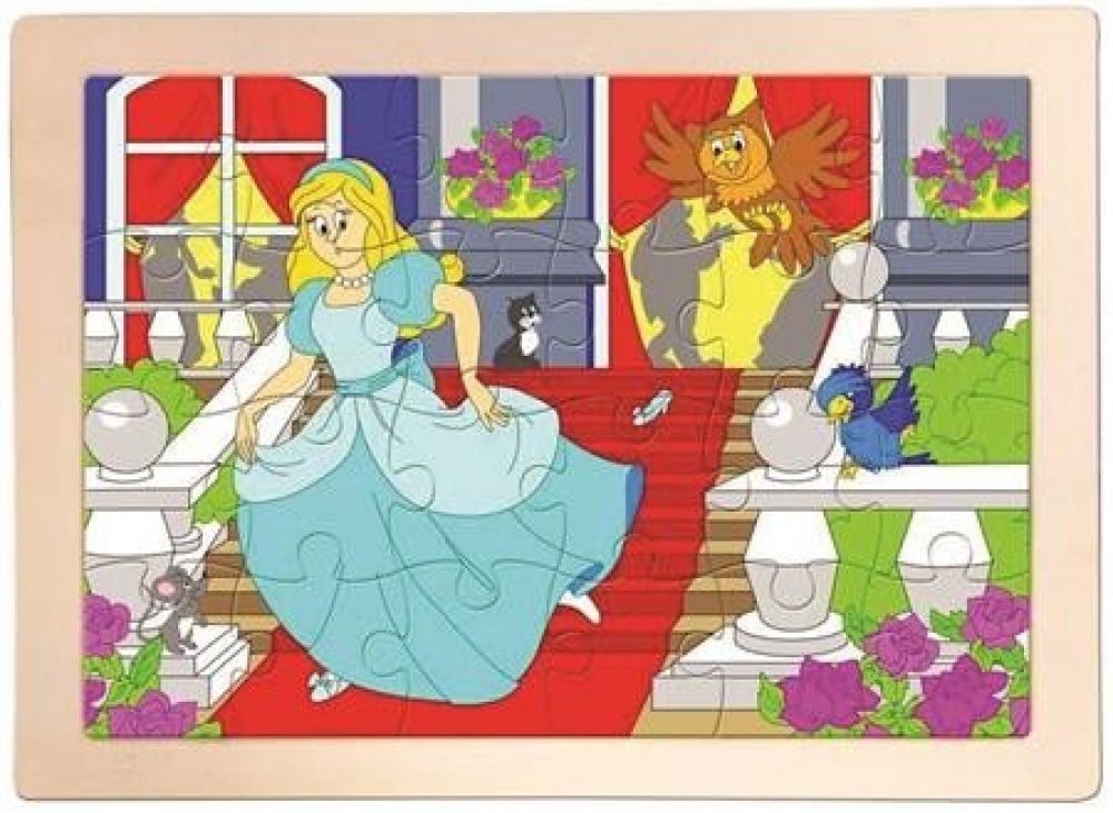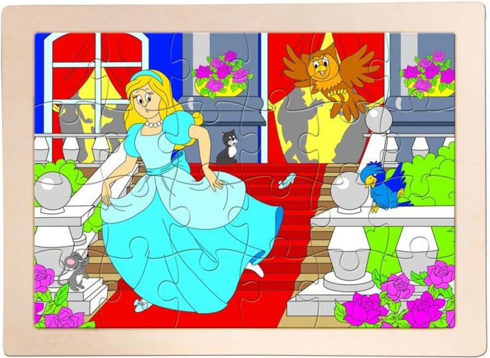 Barevné dřevěné puzzle o 24 dílech s motivem pohádky o Popelce. Na každém dílku je zobrazena část celku nebo alespoň lísteček či šneček tak, aby se dítě snadno orientovalo a lépe skládalo. Puzzle se skládá do dřevěného rámečku.