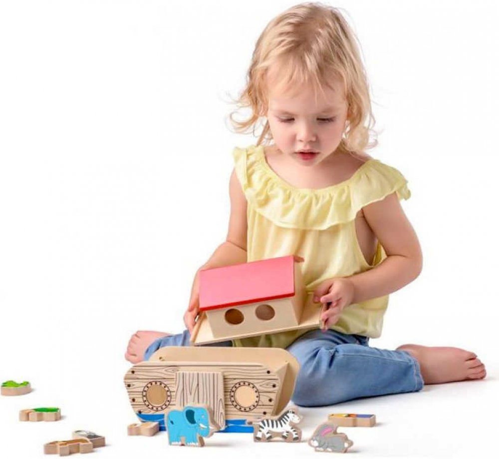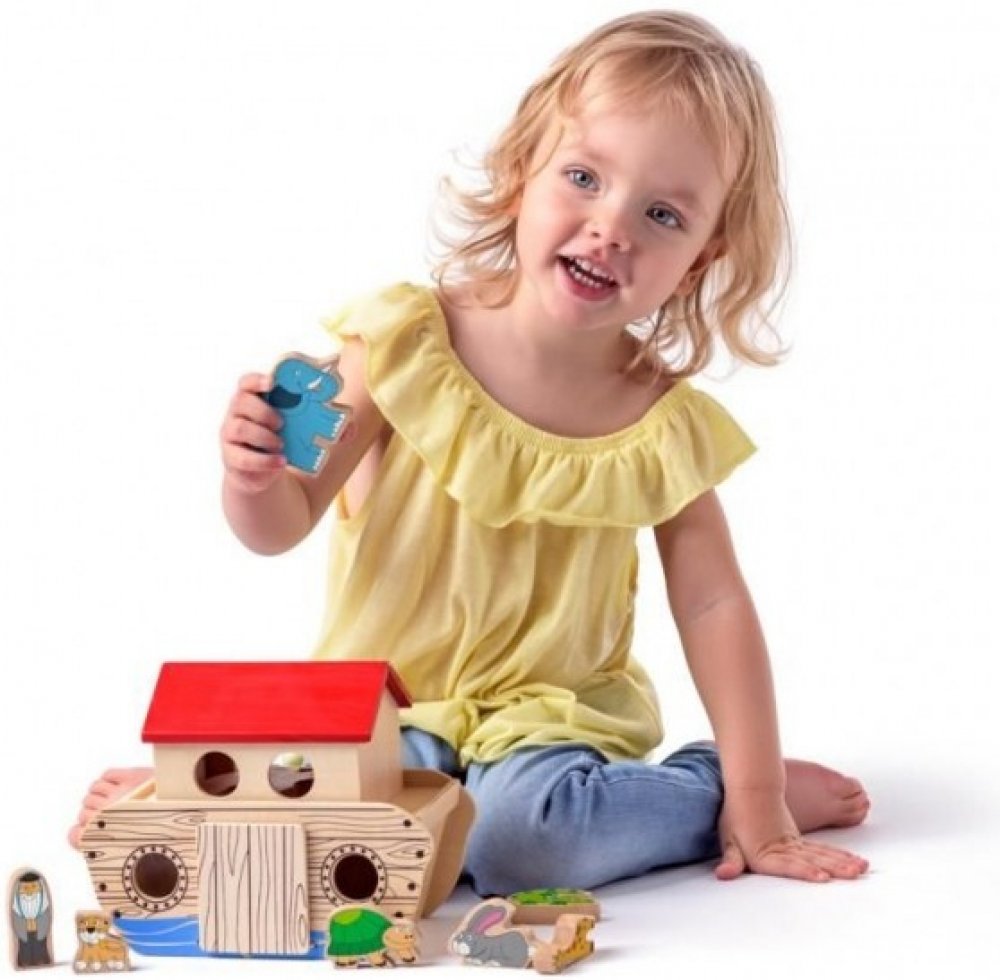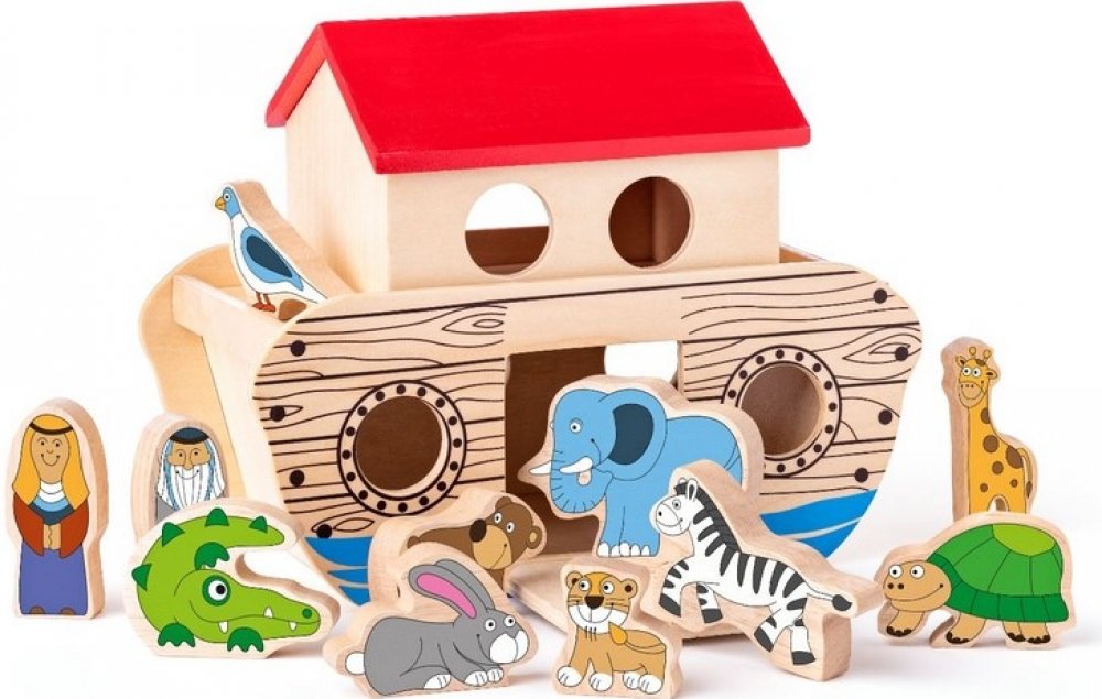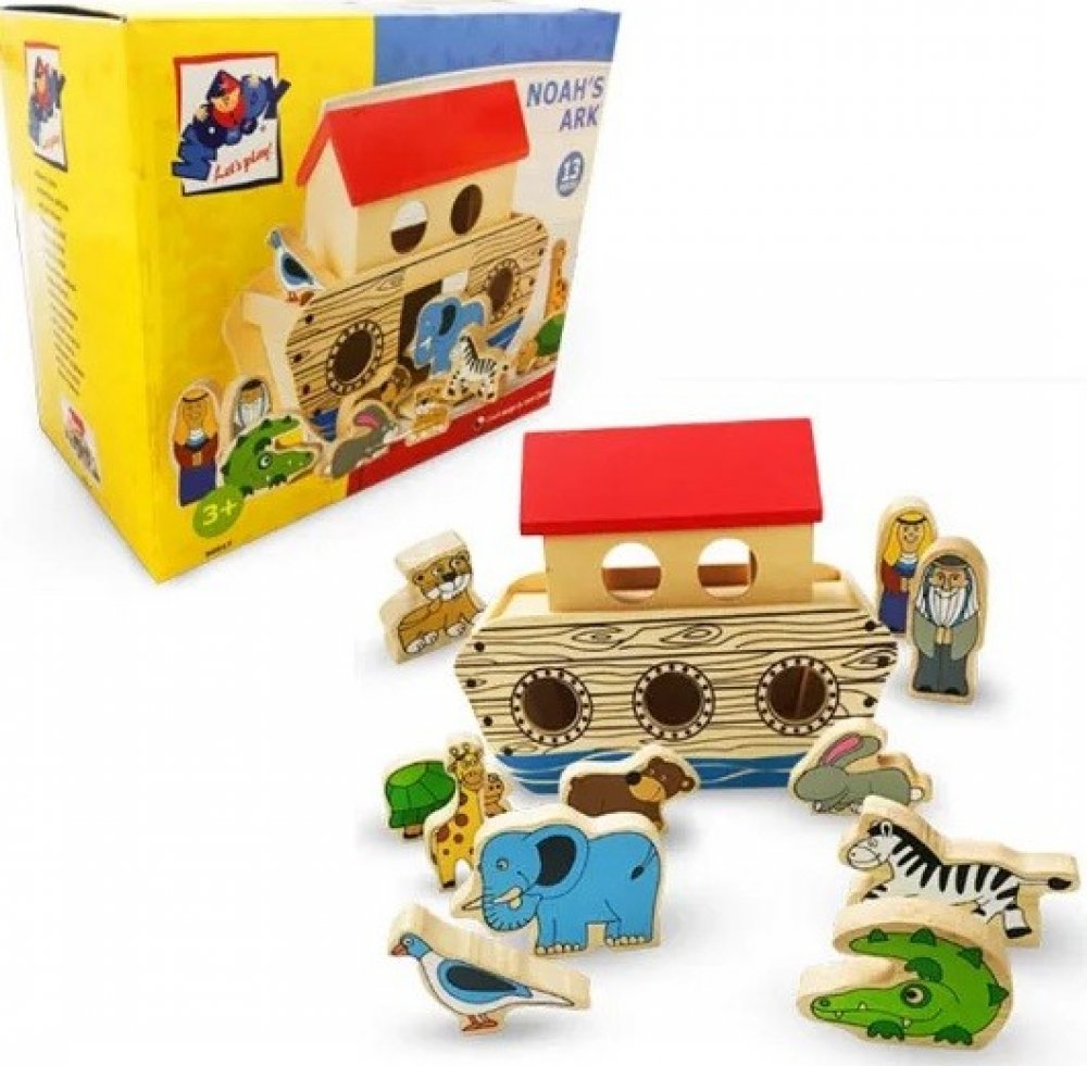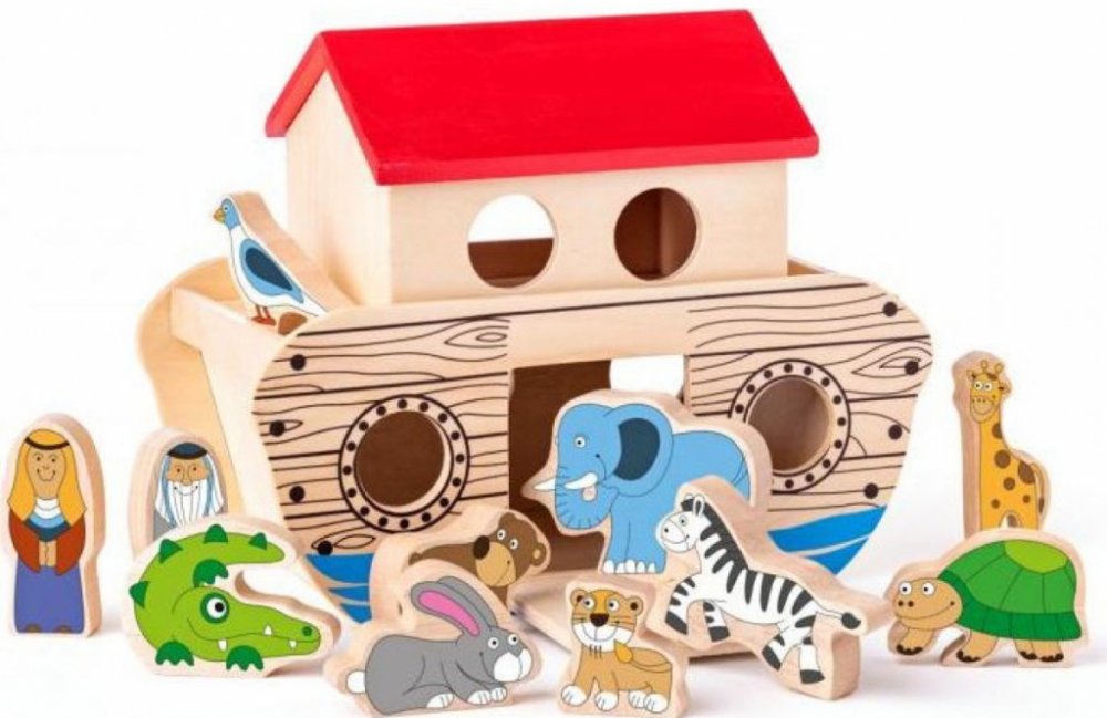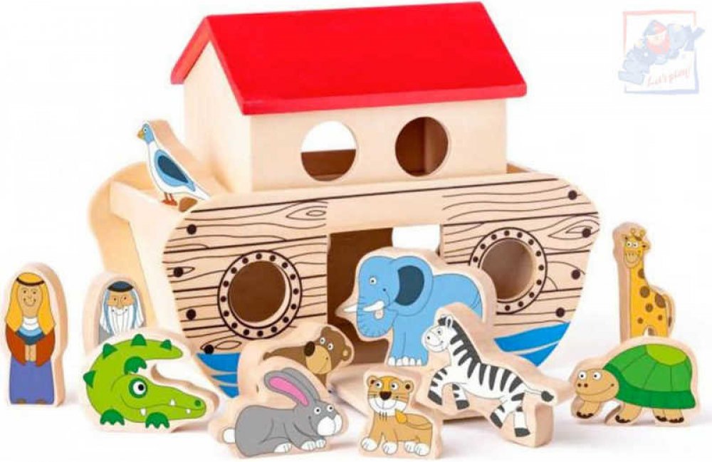 Součástí jsou dřevěné figurky zvířátek a dřevěné postavičky Noeho a jeho ženy.