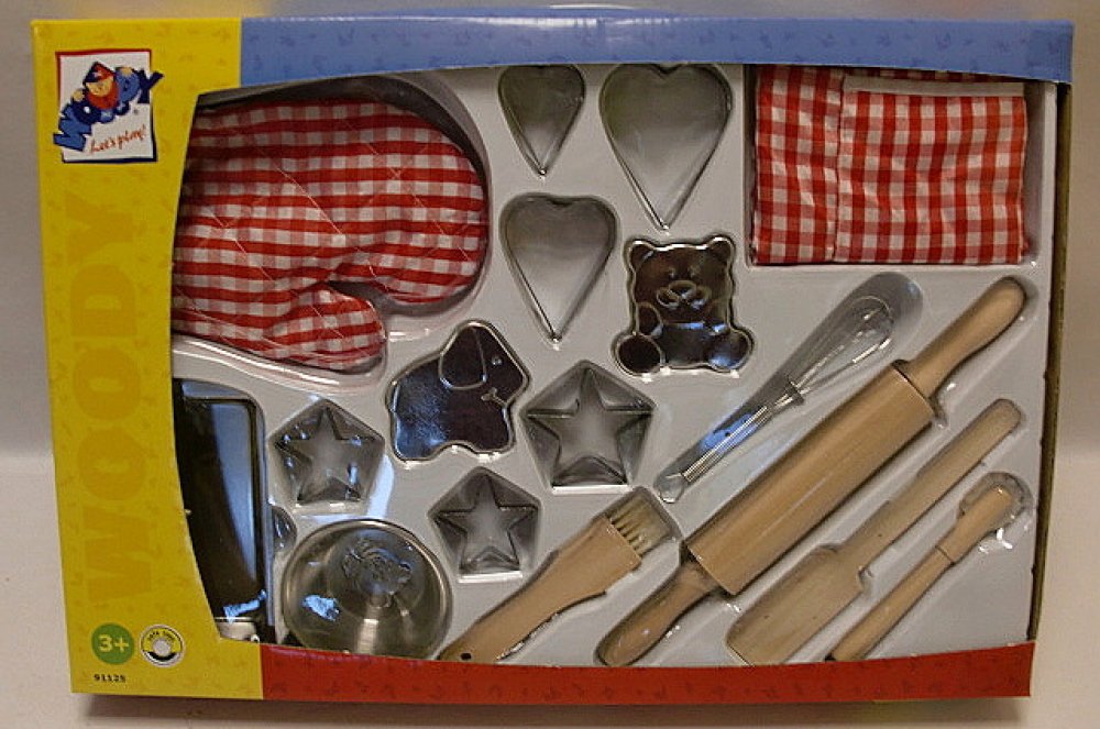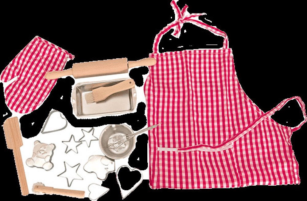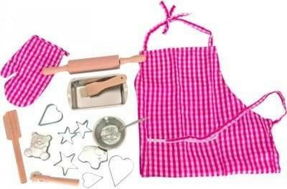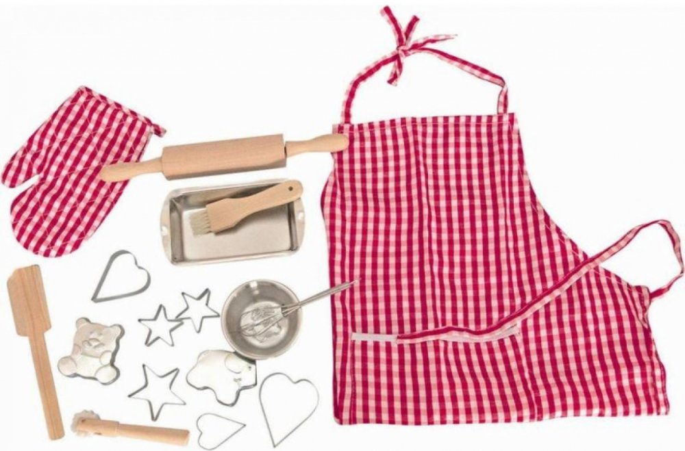 Set obsahuje: Chňapku 18 cm, tvořítka 5 - 7 cm, kuchyňské náčiní 12 - 25 cm, pekáček 14 cm, misku 7,5 cm, zástěrku s kapsou 55 x 44 cm (měřeno bez zavazovacích šňůrek). Celkem 17 kusů kuchyňského náčiní.