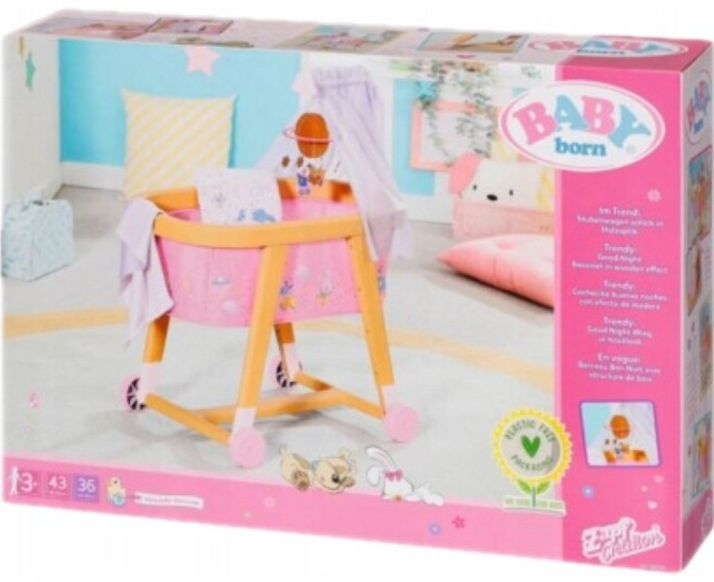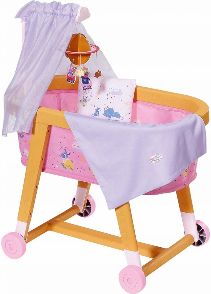 Když si bude chtít BABY born po obědě zdřímnout, budou ji mít maminka s tatínkem v BABY born Postýlce na kolečkách stále na očích. Díky praktickým kolečkům lze postýlku s moderním vzhledem pohodlně posouvat po dětském pokoji. Látková část je zavěšena na rámu v moderním vzhledu dřeva. Uvnitř se budou malí snílci cítit opravdu pohodlně. Růžová postýlka pro BABY born je potlačena jejími zvířecími kamarády, kteří se doslova dotýkají hvězd. Roztomilá deka a polštářek jsou velmi příjemné. Medvídek Bruno se na obrázku na polštářku věnuje své oblíbené činnosti – zimnímu spánku. Zajíček Benno hopsá z jednoho obláčku na druhý a zřejmě hledá skřítka Hajáska. Kolotoč ve tvaru planety přitahuje pozornost pod nebesy z jemné fialové látky. Kvalitní doplněk pro originální panenku BABY born. Pro radost z nápadité, rozmanité a dlouhotrvající hry. Vhodný i pro menší panenky. BABY born Postýlka na kolečkách s látkovými nebesy, kolotočem ve tvaru planety, dekou a polštářkem.