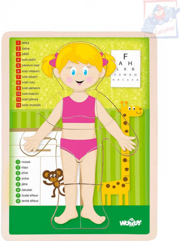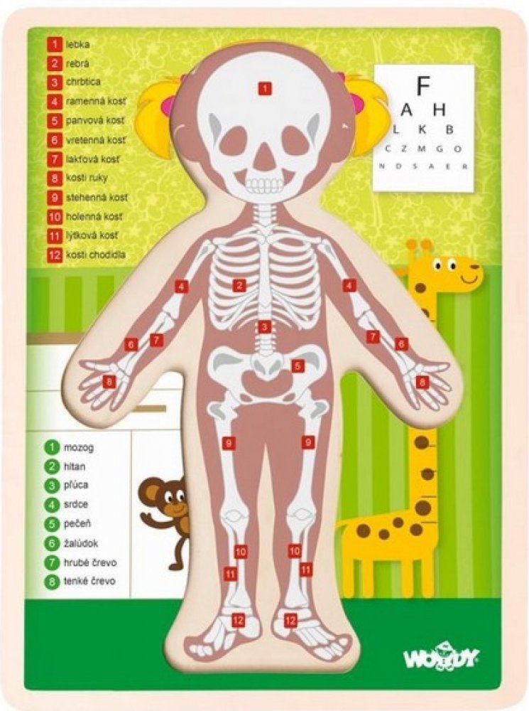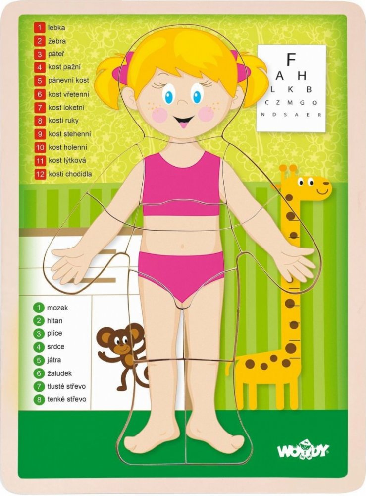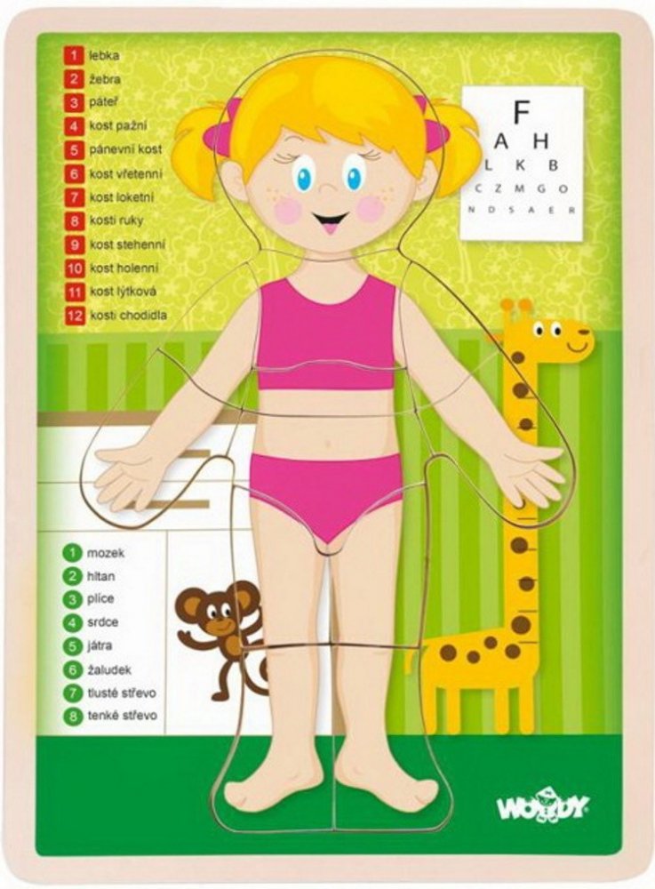 Usměvavá, rovně stojící holčička, je námětem pro vzdělávací puzzle obrázek, který si děti mohou sestavit z třinácti dílků na připravené podložce. Pod každým z dílků je zakreslený orgán a kosti, které se na tomto místě v jejím těle ukrývají. Děti s tímto obrázkem snadněji získávají přehled o lidském tělě.