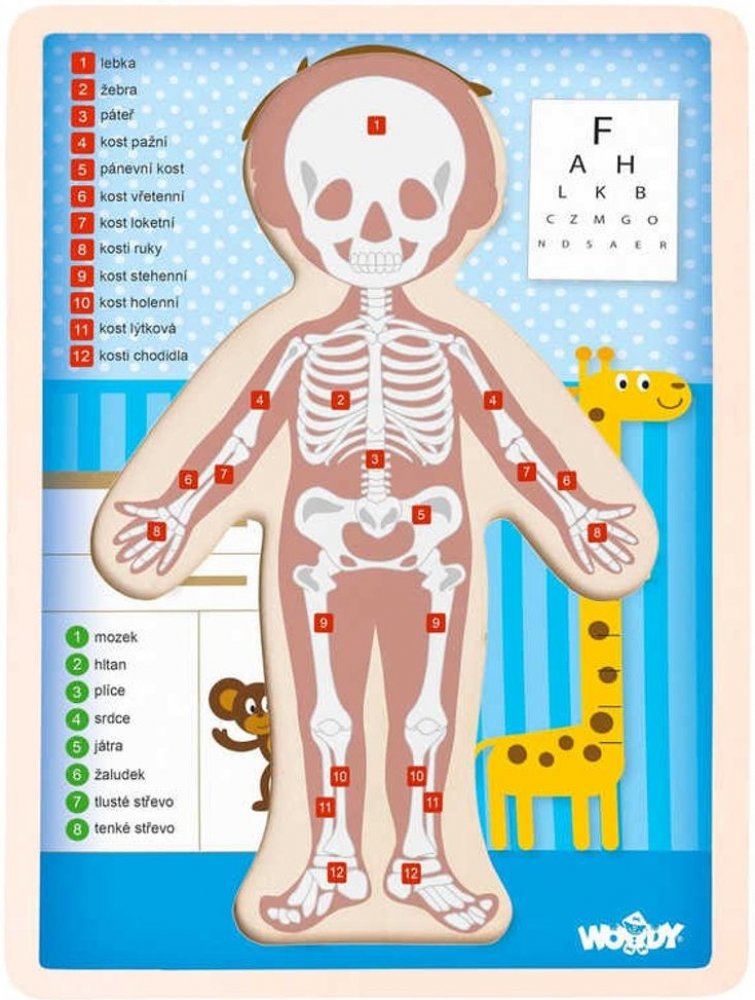 Usměvavý, rovně stojící kluk, je námětem pro vzdělávací puzzle obrázek, který si děti mohou sestavit z třinácti dílků na připravené podložce. Pod každým z dílků je zakreslený orgán a kosti, které se na tomto místě v jejím těle ukrývají. Děti s tímto obrázkem snadněji získávají přehled o lidském tělě.