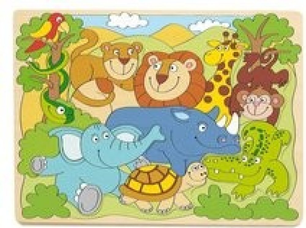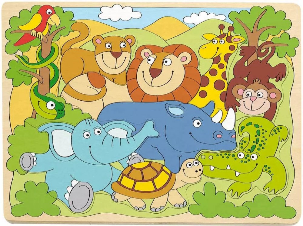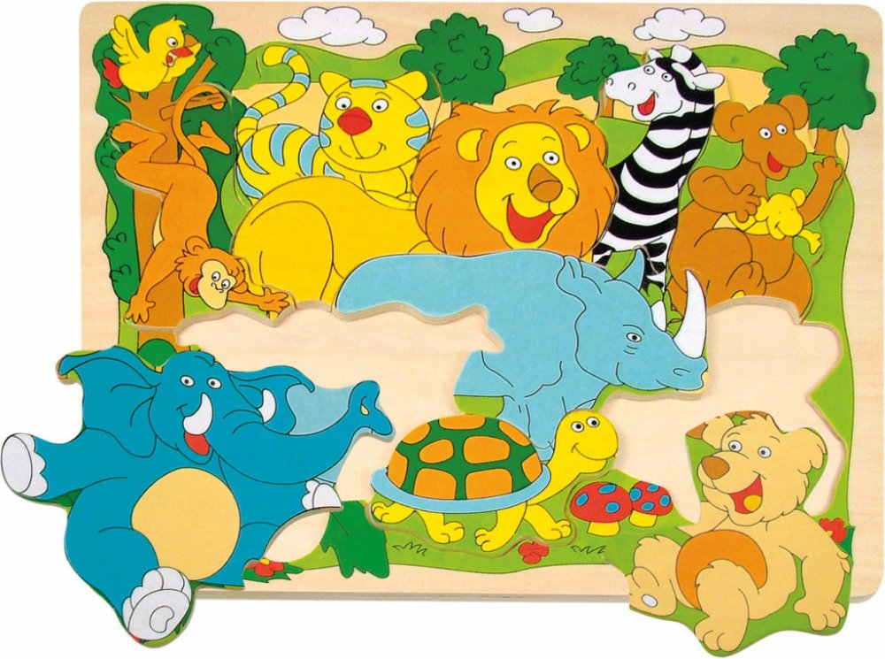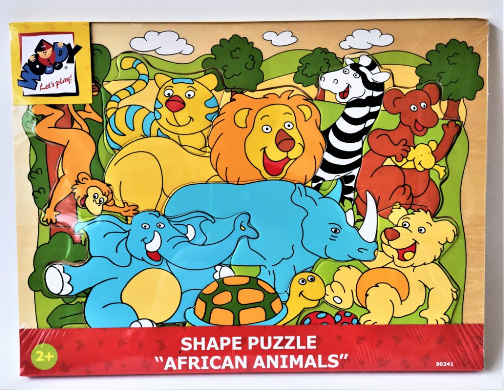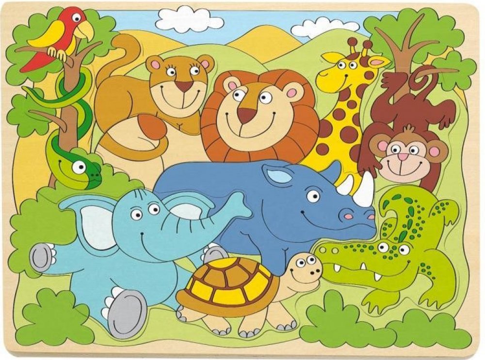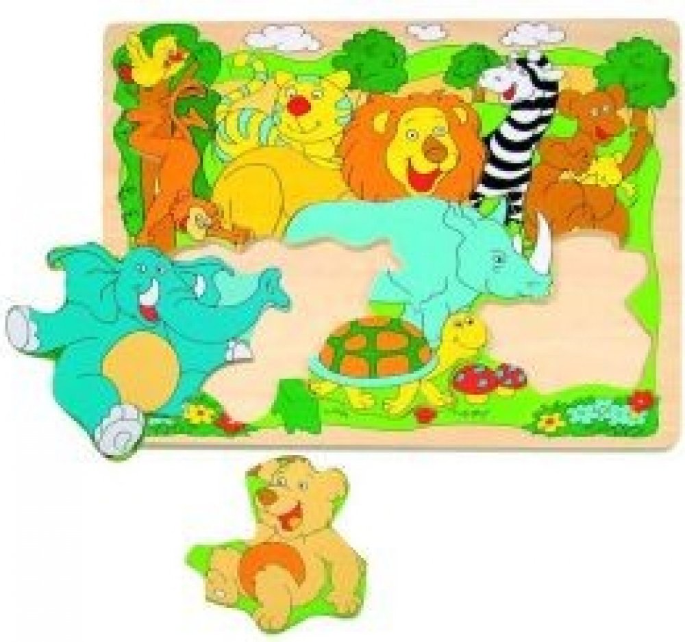 Vkládací puzzle v rámečku s motivem veselých afrických zvířátek. Puzzle je tvořeno skupinkou zvířat, která jsou od sebe oddělena výsekem. Při skládání je dítě skládá tak, aby znovu vytvořily jeden celek.