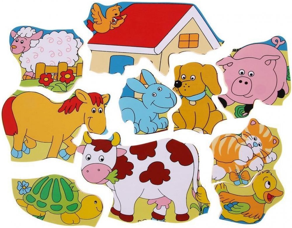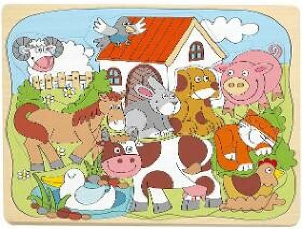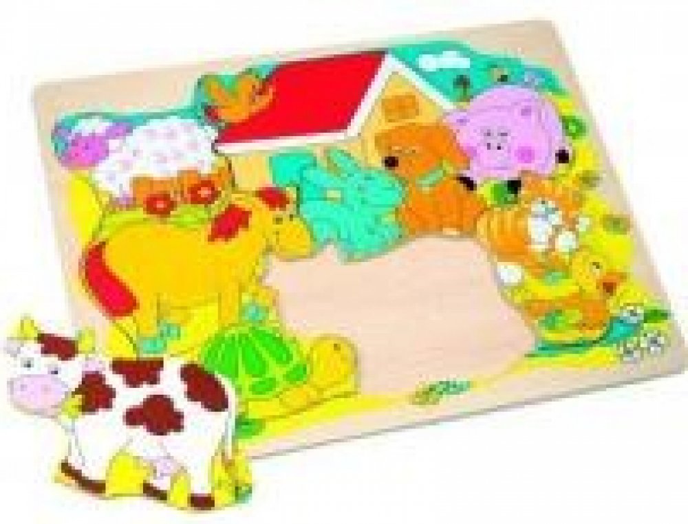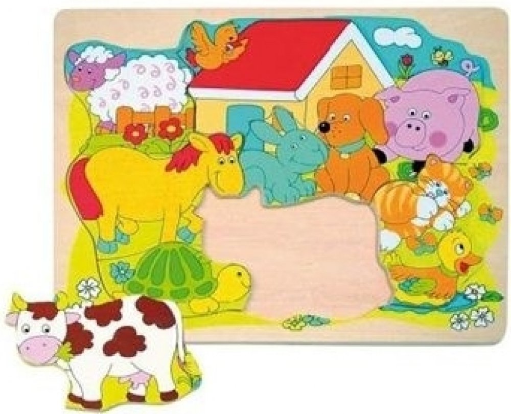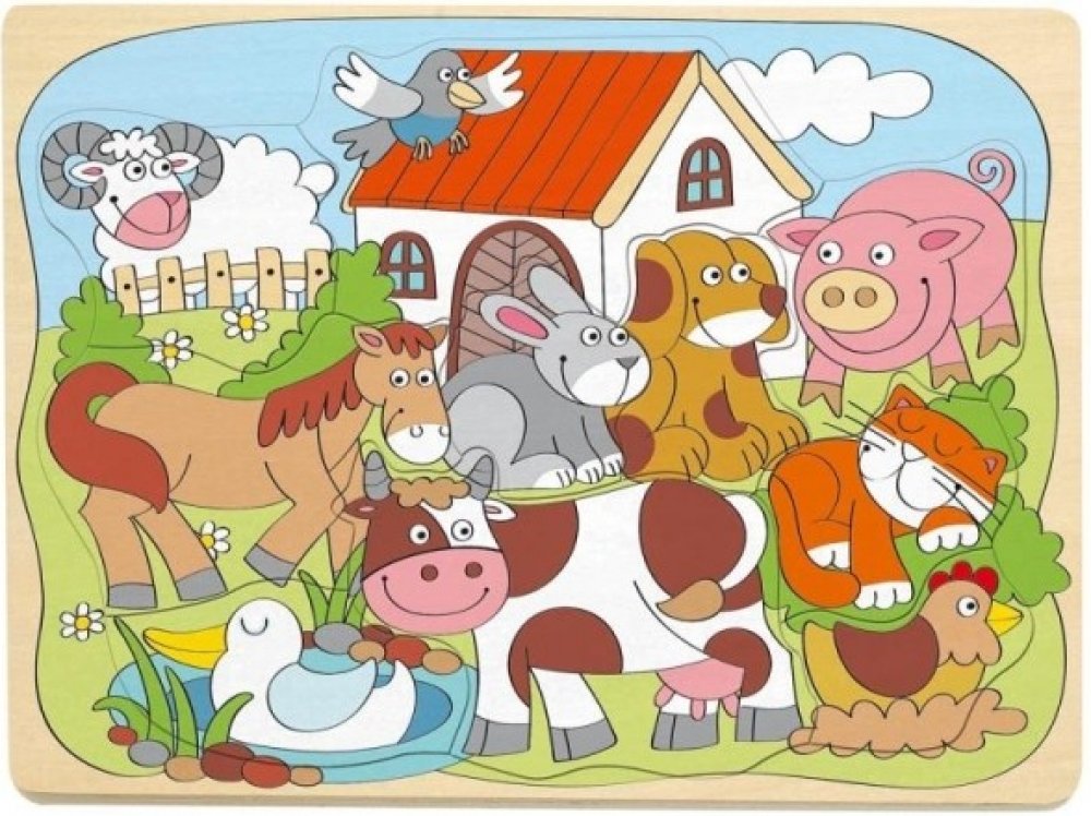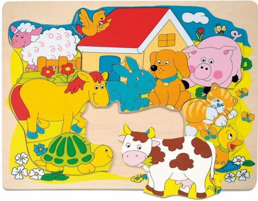 Puzzle na desce Domácí veselá zvířátka - jedná se o puzzle na dřevěné desce s obrázky domácích zvířátek. Jednotlivé dílky skládačky mají ideální velikost pro malé dětské ručičky, což Vaše ratolesti při hře zaručeně ocení. Puzzle je vyrobeno z kvalitního materiálu a provedení produktu je poutavé a barevné. V neposlední řadě tato hračka pomáhá rozvíjet jemnou motoriku Vašeho dítěte.