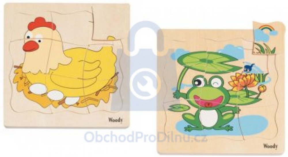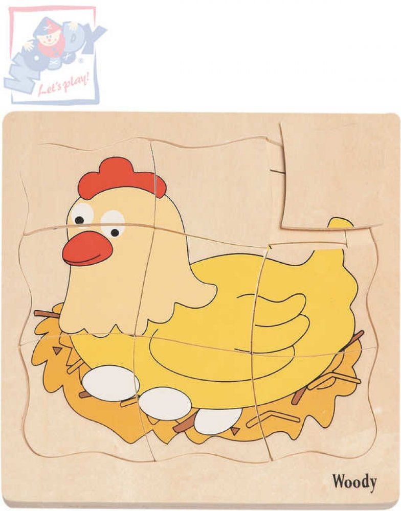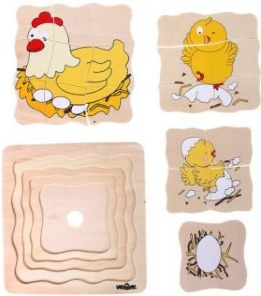 Nová forma edukativní zábavy. Vývojové puzzle je nejen nevšední dřevěnou hračkou, ale i výbornou učební pomůckou. Puzzle se skládá ze čtyř obrázků, z nichž každý zobrazuje jedno vývojové stádium slepičky. Každá vrstva má jiný obrázek a odlišný počet dílků. Vícevrstvé dřevěné puzzle je umístěné v desce (jednotlivé vrstvy různě vyfrézované) s pevným okrajem, která slouží zároveň jako podložka pro skládání.