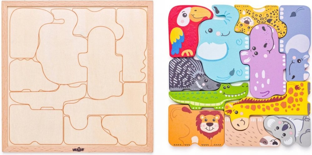 Dřevěná skládačka se zvířátky, na desce. Puzzle je tvořeno skupinkou exotických zvířat, která do sebe zapadají a jako celek tvoří čtverec. Design české návrhářky.