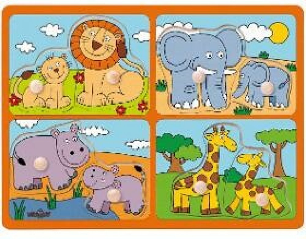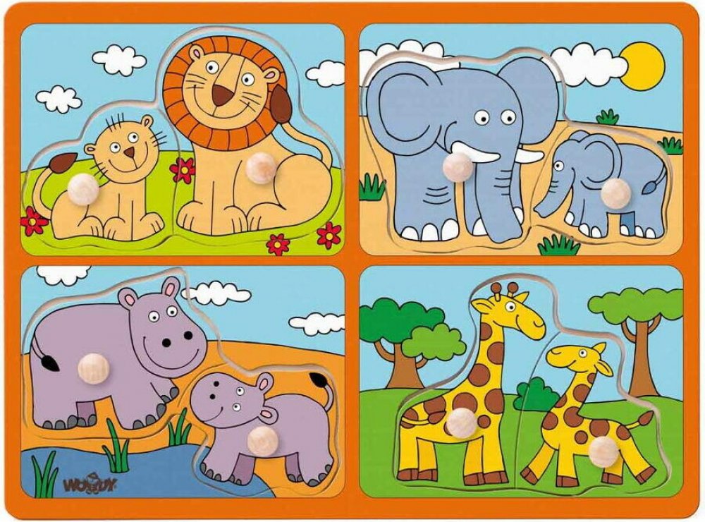 Puzzle WOODY Puzzle Safari zvířata Puzzle z dílny českých návrhářů je určeno pro nejmenší děti Jeden díl puzzle tvoří mládě a druhý dospělý Úkolem dítěte je logicky a podle tvaru přiřadit zvířátka k sobě Puzzle je vybaveno úchyty pro snadnější úchop 8 dílků Věk 2+ Rozměr 22 x 29,5 cm