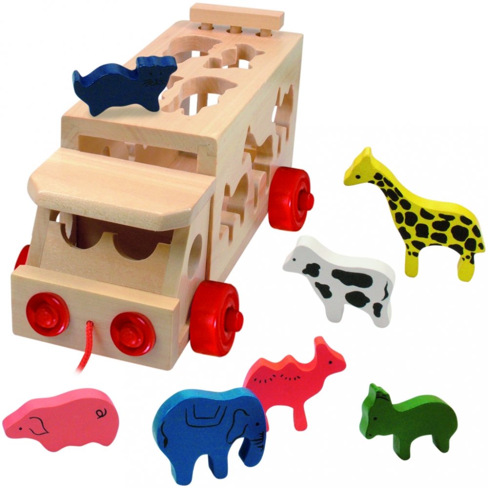 Vkládací dřevěné autíčko kamion s barevnými zvířátky učí dítě znát tvary zvířátek a vkládat je do patřičných otvorů. Hračka napomáhá rozvoji jemné dětské motoriky. Obsahuje provázek na tahání.
