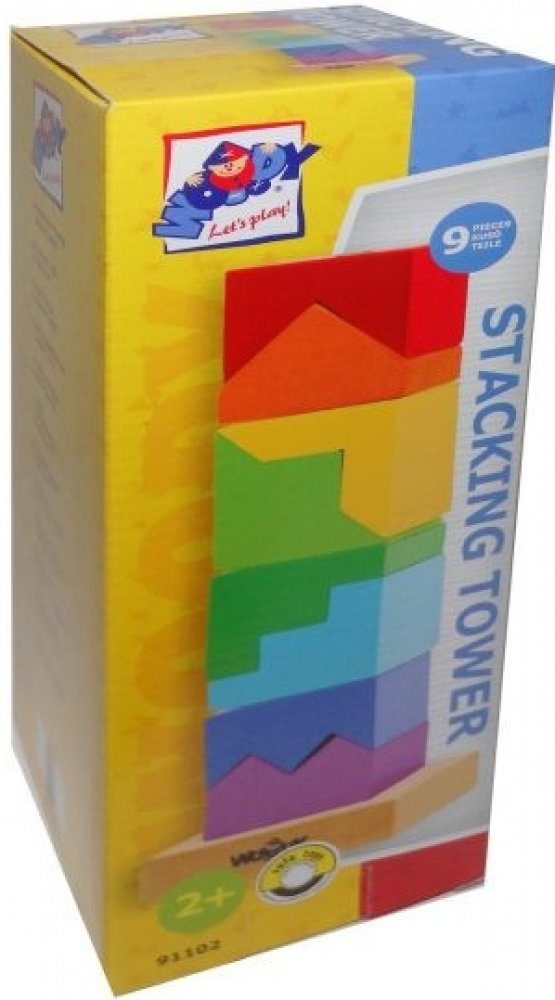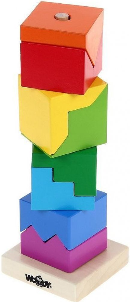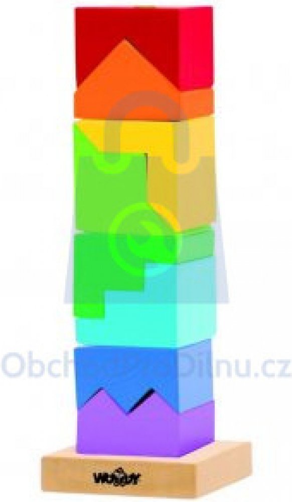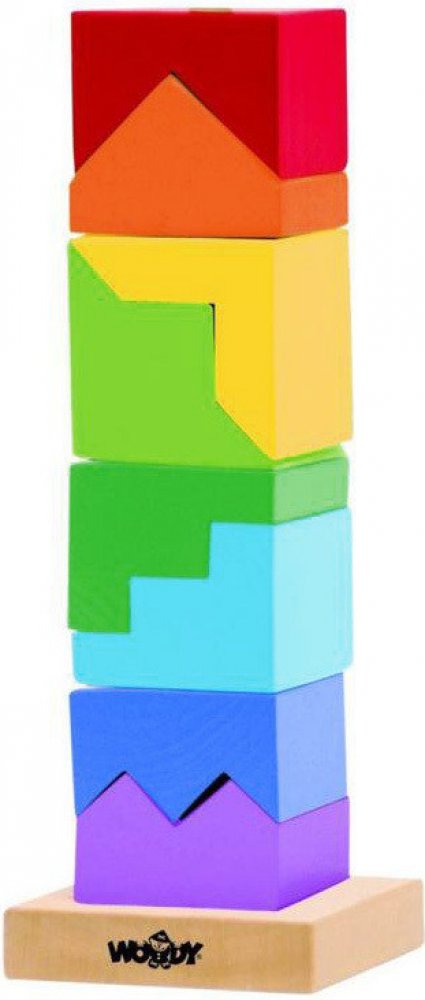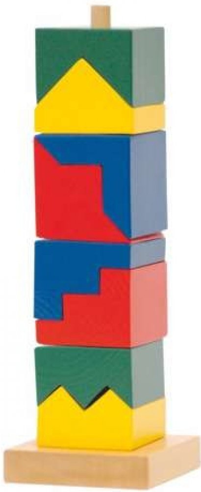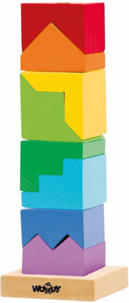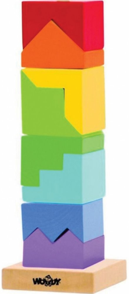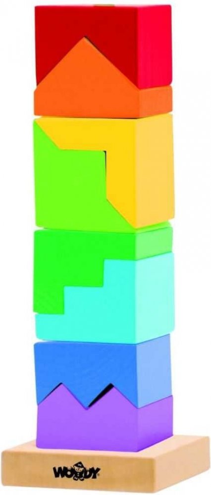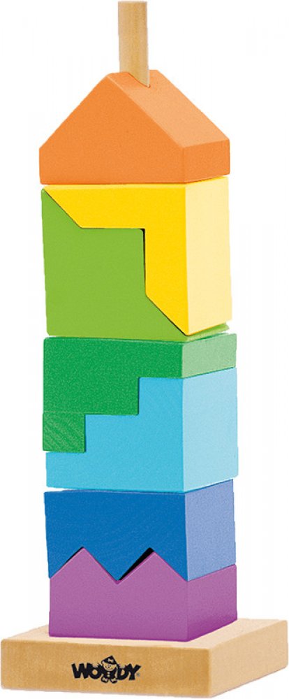Skládanka z dřevěných kostiček nabídne zábavné chvíle každému dítěti. Z této povedené skládanky lze postavit veselou barevnou věž. Obsahuje podstavec s jednou tyčkou, na něž se kostičky navlékají. Tato činnost dítě nejenom zabaví, ale bude mít příznivý vliv na rozvoj jeho motorických schopností, logického uvažování a představivosti.