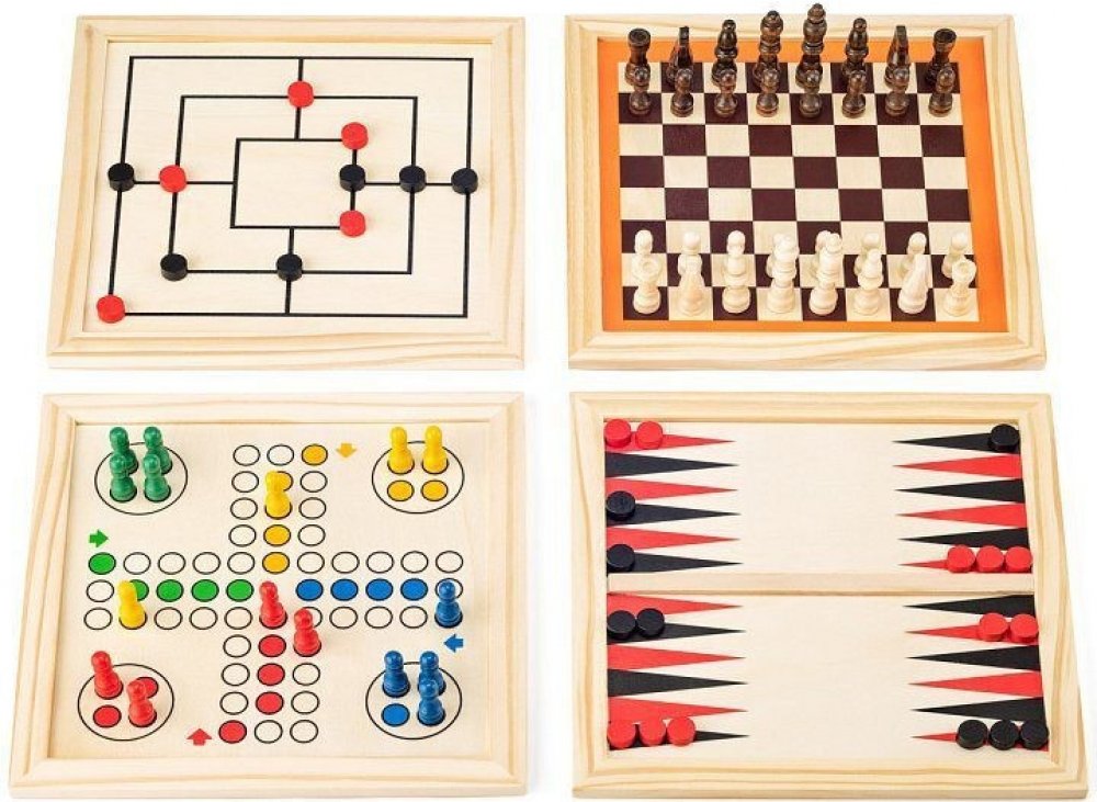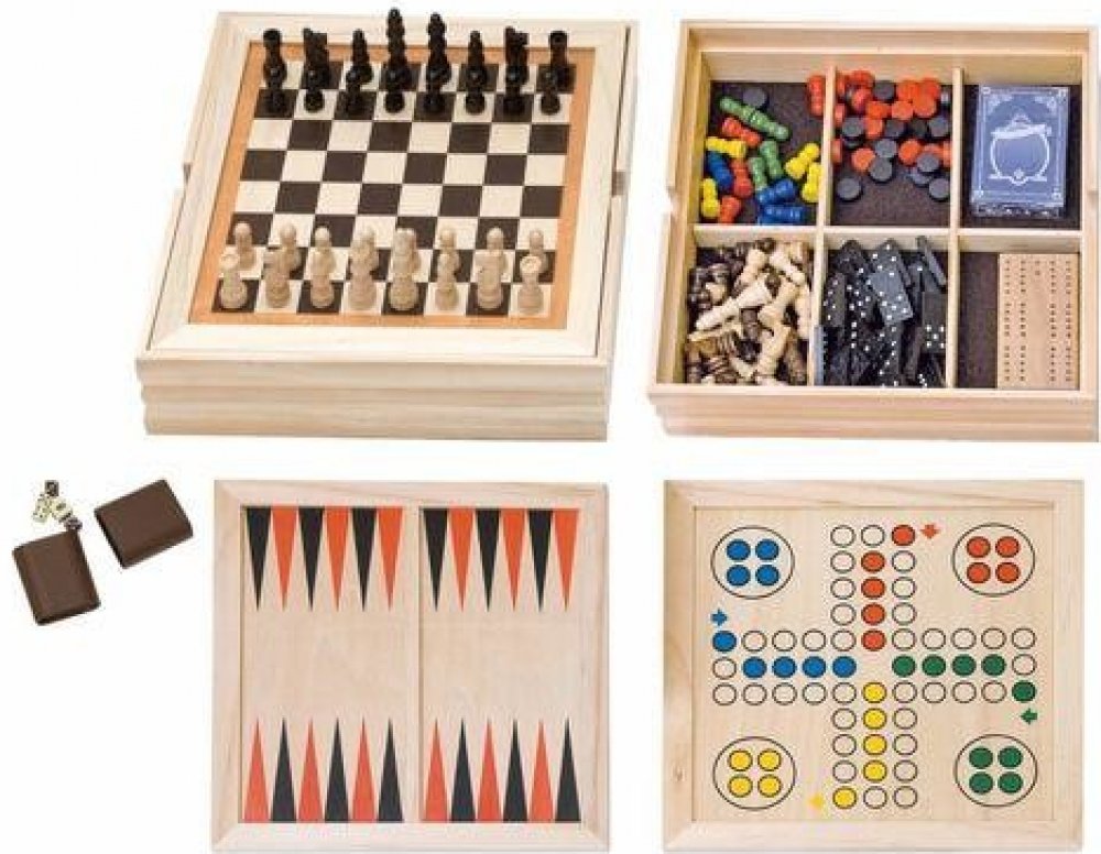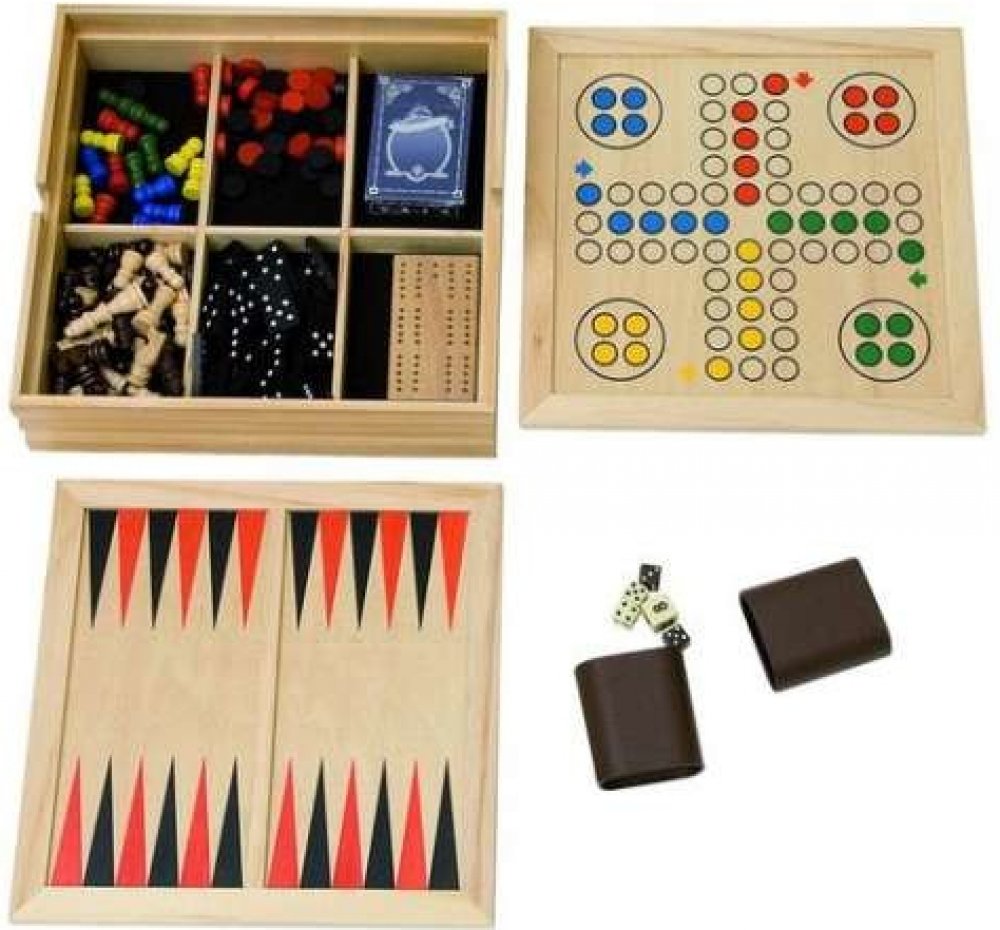 Několik stolních her v jednom dřevěném boxu - šachy, dáma, člověče nezlob se, vrchcáby, backgammon, mlýn, kameny pro domino, kostky a karty. Obsahuje i návody ke hrám.| Věk: 5+ | Rozměry: 27 x 27 x 7 cm