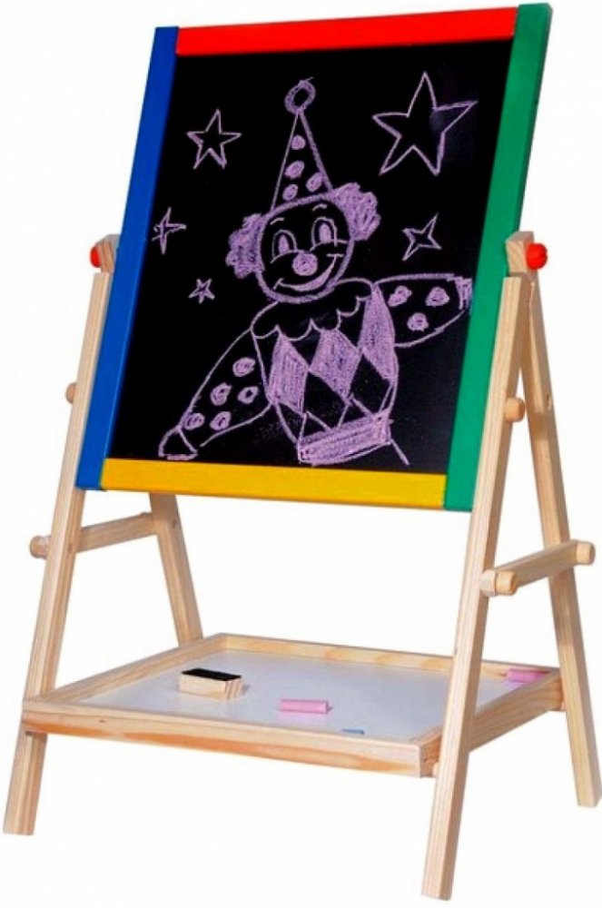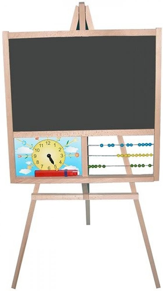 Oboustranná dřevěná tabule s poličkou.