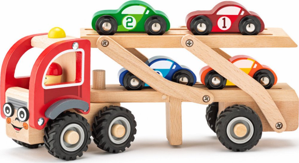 Tahač, návěs i auta jsou vyrobeny z tvrdého masivního dřeva. Patrová plošina pro auta se dá sklopit tak, aby auta mohla najet a zase sjet z rampy. Tahač a návěs se dají odpojit.