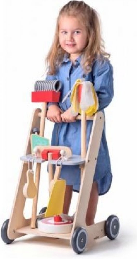 Úklidový vozík ve dřevěném provedení má vestavěný vysavač, otvory pro mop a smeták, lopatku, saponát a malý kartáč na zvířecí chlupy.