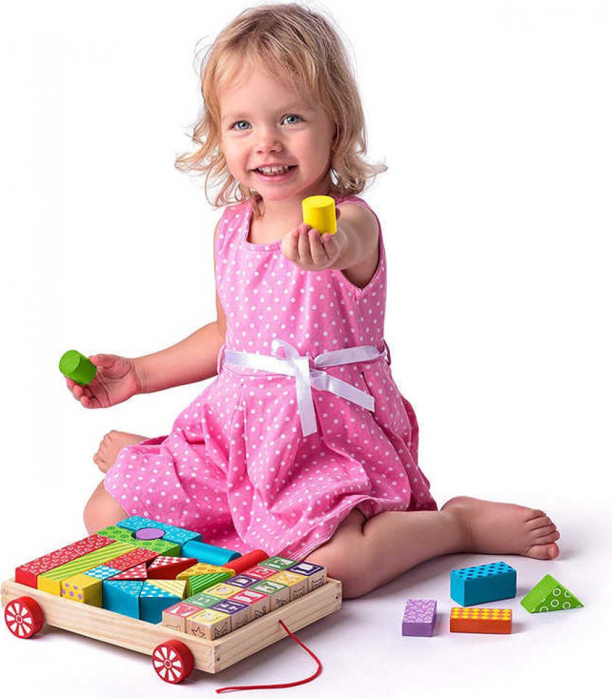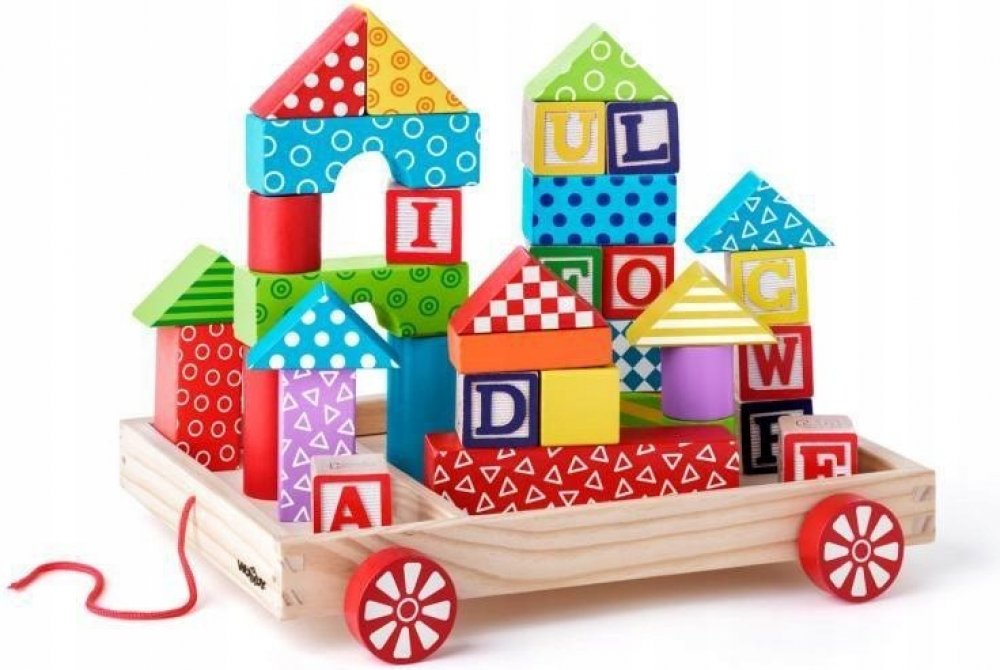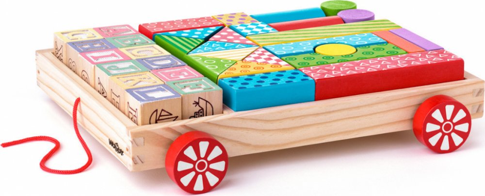 barevném provedení s potiskem. Hračka je kombinací tahací hračky a stavebnice. Dítě se naučí rozlišovat barvy, čísla, zvířata a další dětské motivy.