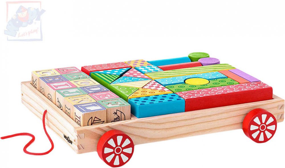 Woody Vozík tahací s kostkami a razítky set 35 ks