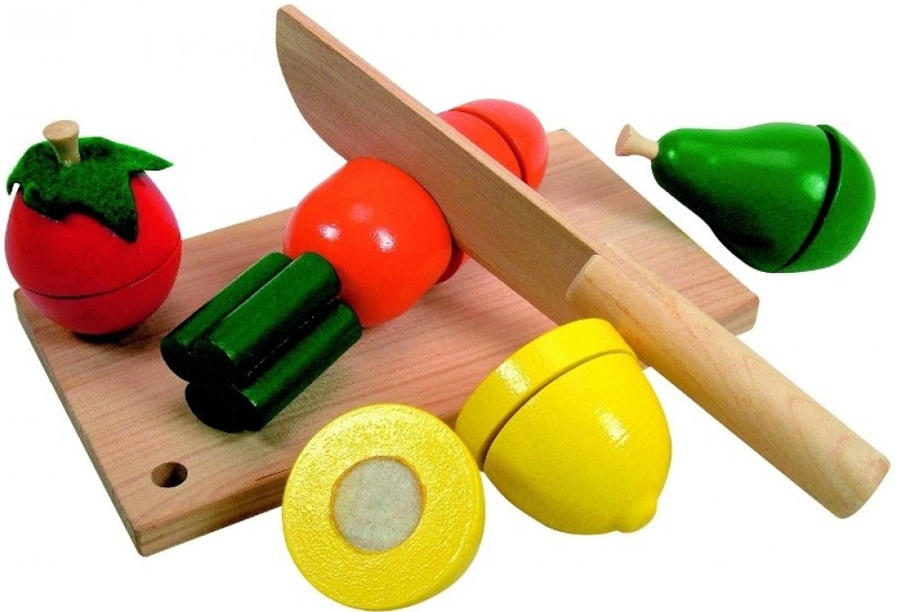 Dětská dřevěná napodobenina "krájecího" ovoce nebo zeleniny na suchý zip s příslušenstvím. Jednotlivé dílky jsou spojeny suchým zipem a je možné je jednoduše "krájet" přiloženým nožíkem. Součástí balení je dřevěný nožík a prkénko na krájení.