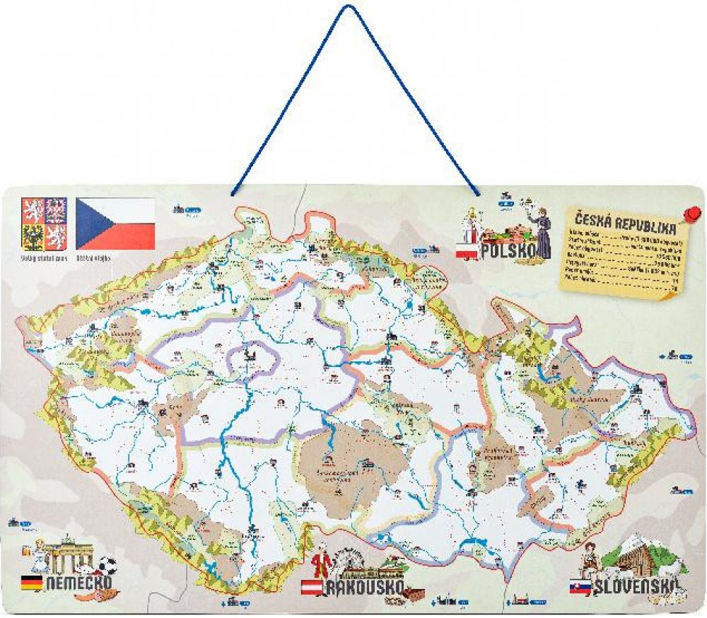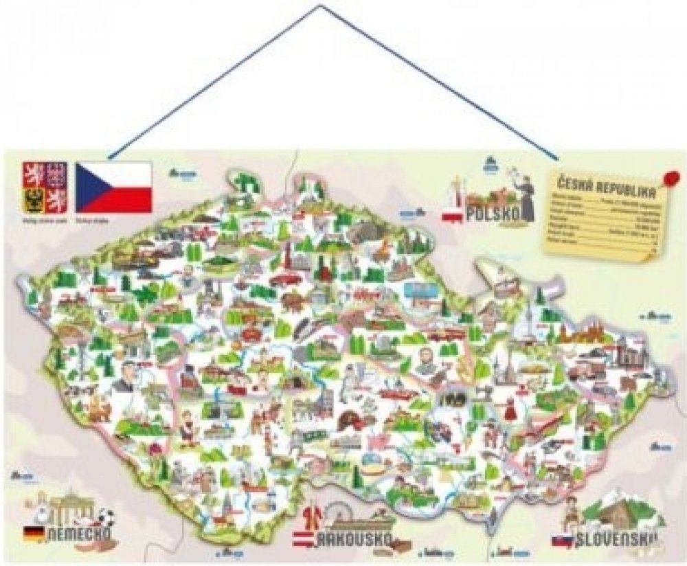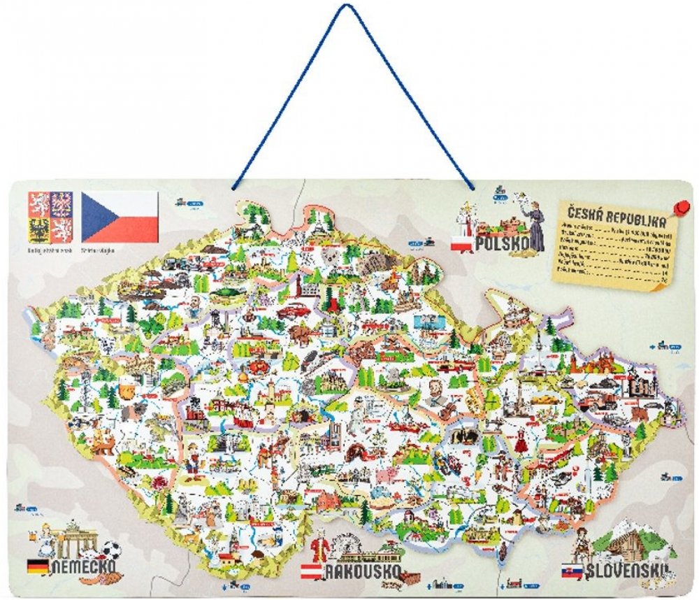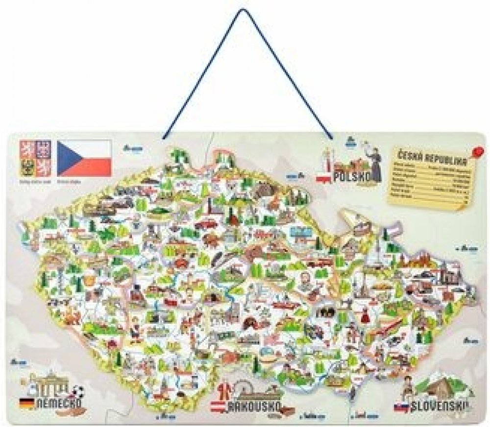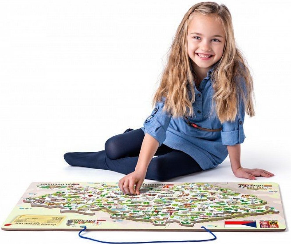 Děti se učí vnímat Českou republiku jako stát, členit ji do jednotlivých okresů, určovat jejich hlavní města, poznávat na mapě řeky a pohoří. Dílky znázorňující konkrétní okresy se přikládají na podkladovou magnetickou plochu. Tenkou červenou linkou jsou vyznačeny hranice okresů, děti tak snadno určí, kam který dílek patří. Prostřednictvím obrázků na jednotlivých dílcích se děti naučí, co se kde v...