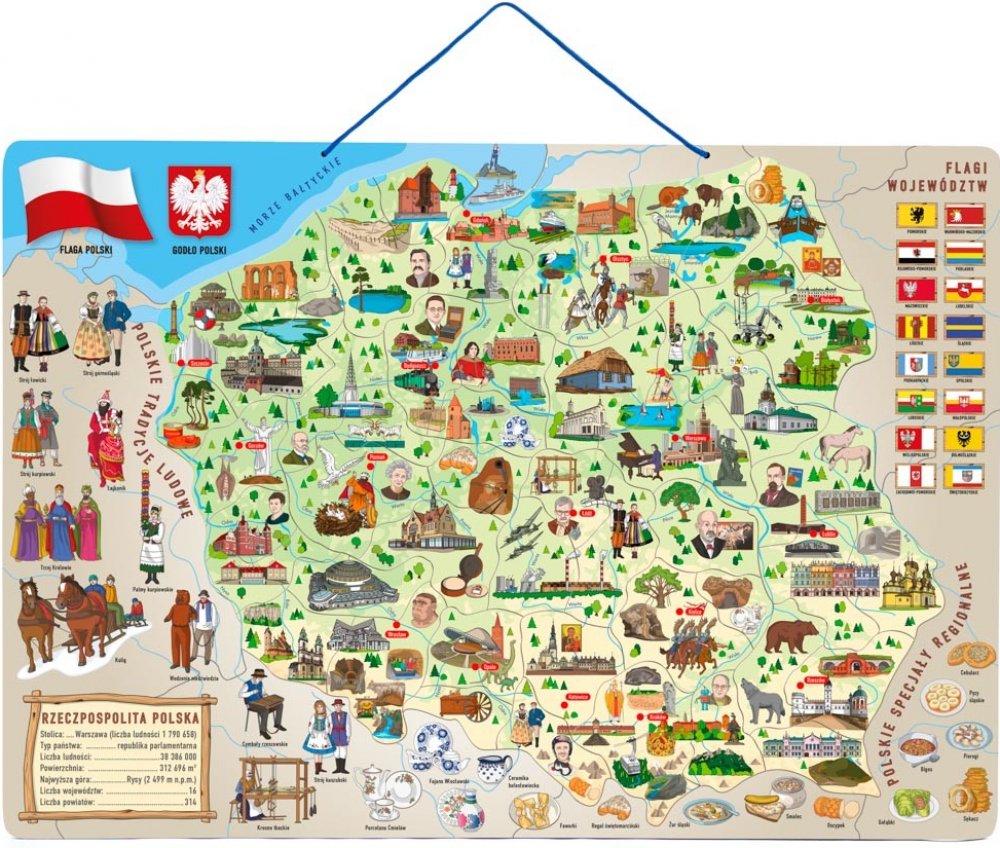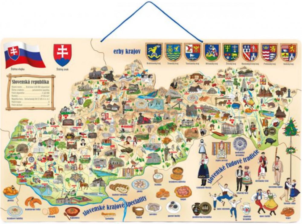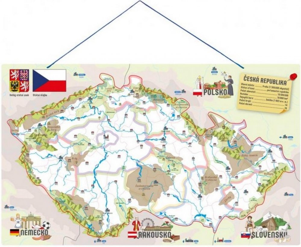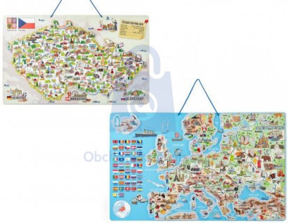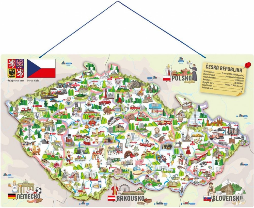 Děti se učí vnímat Českou republiku jako stát, členit ji do jednotlivých okresů, určovat jejich hlavní města, poznávat na mapě řeky a pohoří. Dílky znázorňující konkrétní okresy se přikládají na podkladovou magnetickou plochu. Tenkou červenou linkou jsou vyznačeny hranice okresů, děti tak snadno určí, kam který dílek patří. Prostřednictvím obrázků na jednotlivých dílcích se děti naučí, co se kde v...