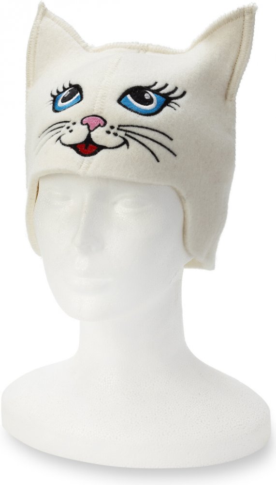 Saunová čepice s veselou modrookou kočkou je vyrobena ze 100% vlny. Saunová čepice má světle krémovou barvu. Na přední pohledové části je vyobrazena kočka s modrýma očima a červeným jazýčkem. Čepice je opatřena stylovými špičatými oušky pro doladění celkového designu. Vlněné čepice jsou určeny pro používání v sauně. Díky použitému materiálu je čepice pevnější, odolnější a trvanlivější. Moderní tec...