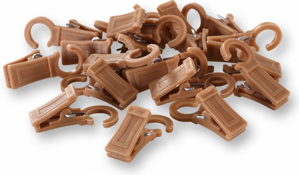 Plastové žabky na záclony slouží, společně s dřevěnými kroužky, k uchycení záclony nebo závěsu na garnýž.