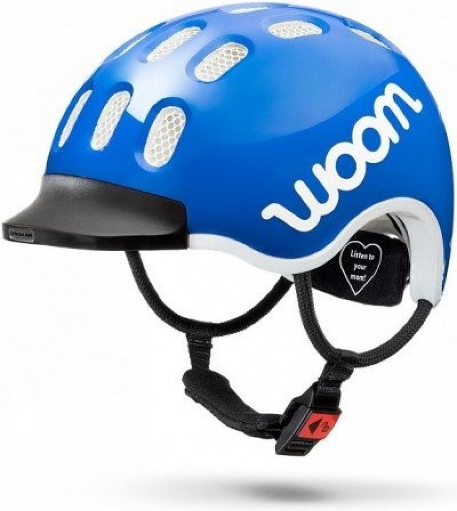 Dětská helma na kolo Woom s rozšířenou ochranou zadní části hlavy a magnetickou přezkou Fidlock.